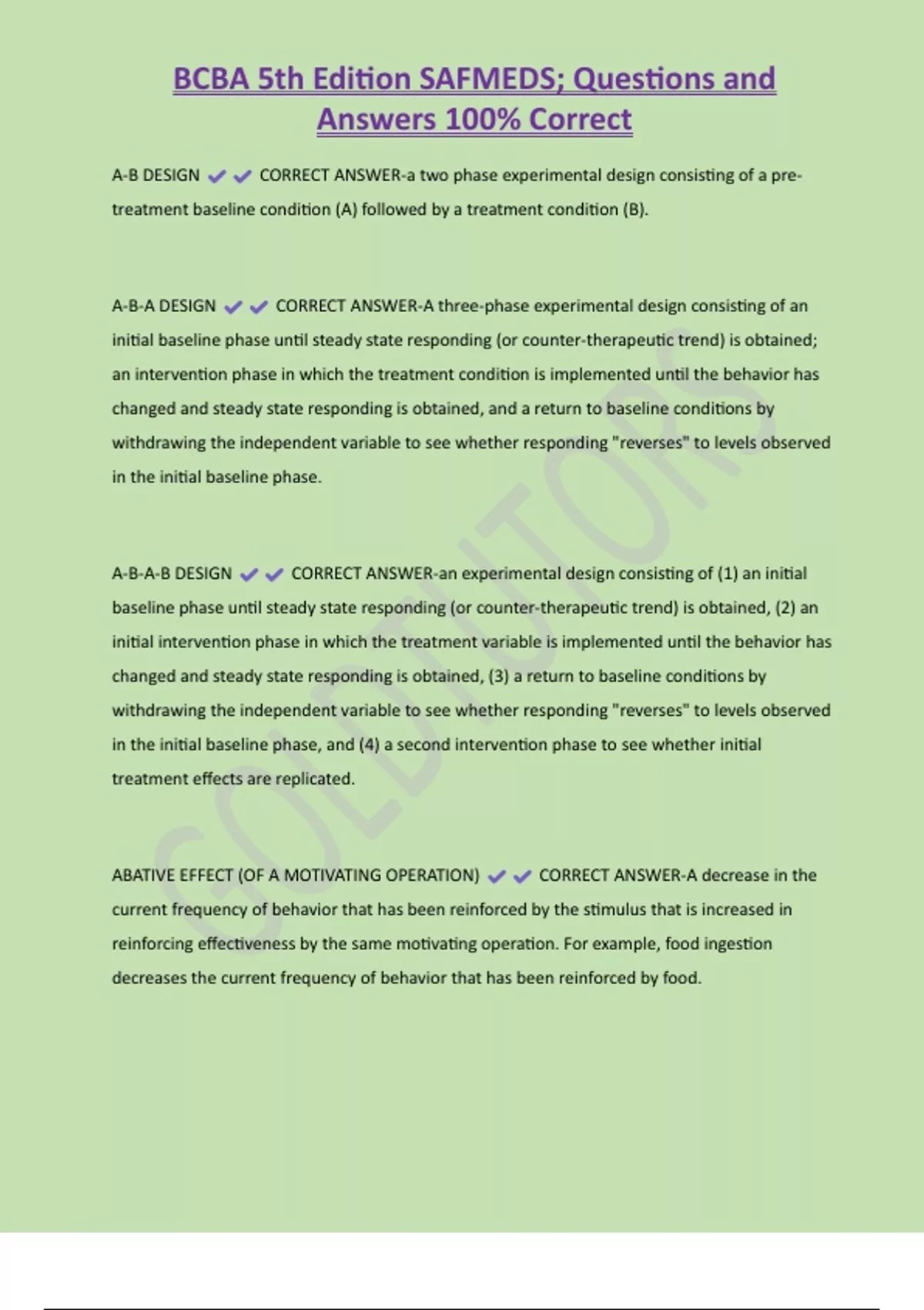 BCBA 5th Edition SAFMEDS; Questions and Answers 100% Correct A-B DESIGN CORRECT ANSWER-a two phase experimental design consisting of a pretreatment baseline condition (A) followed by a treatment condition (B). A-B-A DESIGN CORRECT ANSWER-A three-phase experimental design consisting of an initial baseline phase until steady state responding (or counter-therapeutic trend) is obtained; an intervention phase in which the treatment condition is implemented until the behavior has changed and steady state responding is obtained, and a return to baseline conditions by withdrawing the independent variable to see whether responding "reverses" to levels observed in the initial baseline phase