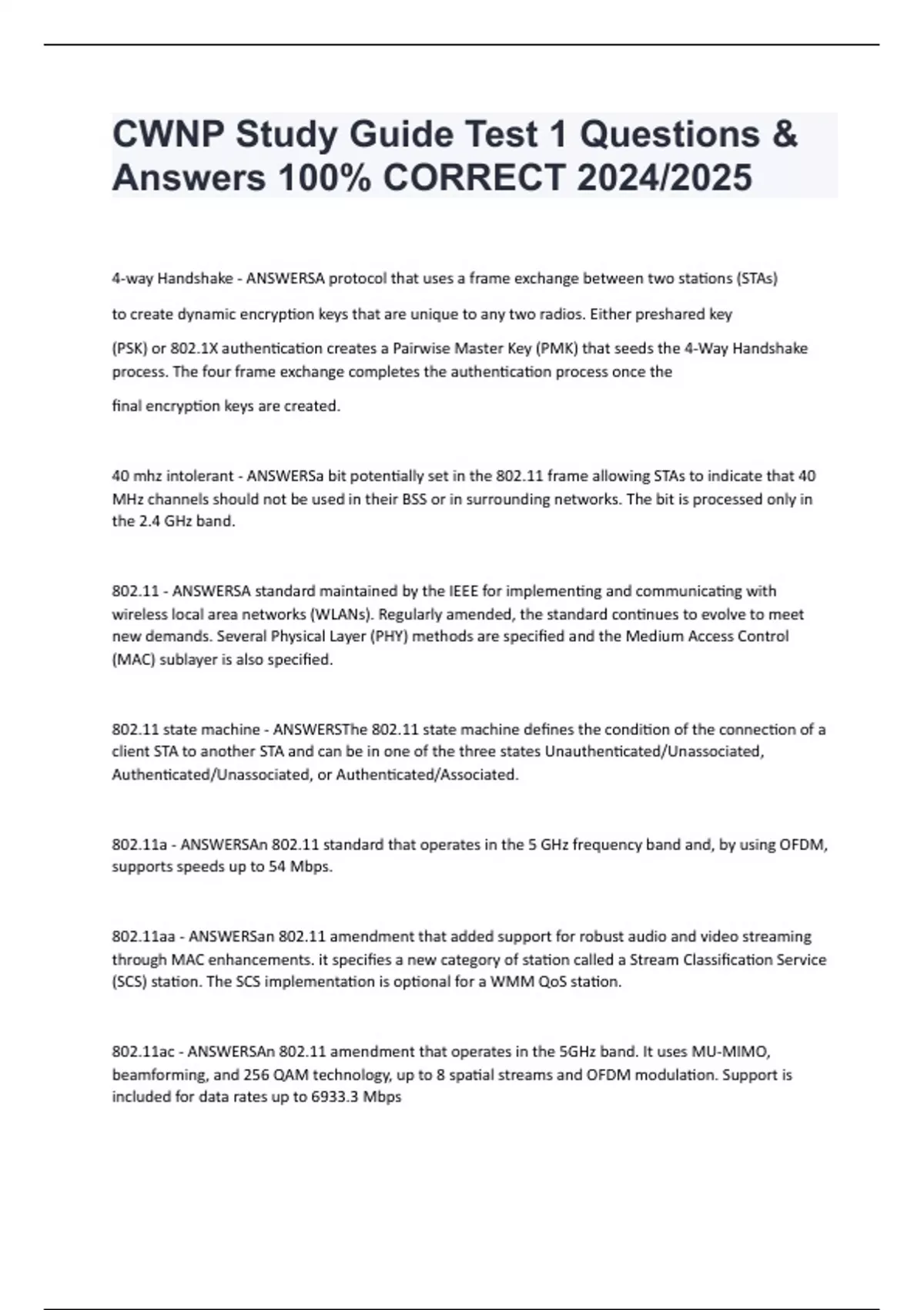 CWNP Study Guide Test 1 Questions & Answers 100% CORRECT 2024/2025 4-way Handshake - ANSWERSA protocol that uses a frame exchange between two stations (STAs) to create dynamic encryption keys that are unique to any two radios. Either preshared key (PSK) or 802.1X authentication creates a Pairwise Master Key (PMK) that seeds the 4-Way Handshake process. The four frame exchange completes the authentication process once the final encryption keys are created. 40 mhz intolerant - ANSWERSa bit potentially set in the 802.11 frame allowing STAs to indicate that 40 MHz channels should not be used in their BSS or in surrounding networks. The bit is processed only in the 2.4 GHz band. 802.11 - ANSWERSA standard maintained by the IEEE for implementing and communicating with wireless local area networks (WLANs). Regularly amended, the standard continues to evolve to meet new demands. Several Physical Layer (PHY) methods are specified and the Medium Access Control (MAC) sublayer is also specified. 802.11 state machine - ANSWERSThe 802.11 state machine defines the condition of the connection of a client STA to another STA and can be in one of the three states Unauthenticated/Unassociated, Authenticated/Unassociated, or Authenticated/Associated. 802.11a - ANSWERSAn 802.11 standard that operates in the 5 GHz frequency band and, by using OFDM, supports speeds up to 54 Mbps. 802.11aa - ANSWERSan 802.11 amendment that added support for robust audio and video streaming through MAC enhancements. it specifies a new category of station called a Stream Classification Service (SCS) station. The SCS implementation is optional for a WMM QoS station. 802.11ac - ANSWERSAn 802.11 amendment that operates in the 5GHz band. It uses MU-MIMO, beamforming, and 256 QAM technology, up to 8 spatial streams and OFDM modulation. Support is included for data rates up to 6933.3 Mbps