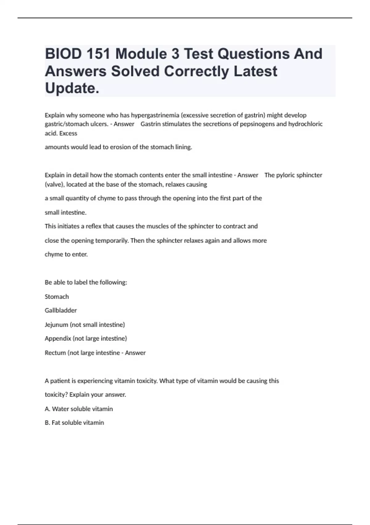 Explain why someone who has hypergastrinemia (excessive secretion of gastrin) might develop gastric/stomach ulcers. - Answer Gastrin stimulates the secretions of pepsinogens and hydrochloric acid. Excess amounts would lead to erosion of the stomach lining. Explain in detail how the stomach contents enter the small intestine - Answer The pyloric sphincter (valve), located at the base of the stomach, relaxes causing a small quantity of chyme to pass through the opening into the first part of the small intestine. This initiates a reflex that causes the muscles of the sphincter to contract and close the opening temporarily. Then the sphincter relaxes again and allows more chyme to enter. Be able to label the following: Stomach Gallbladder Jejunum (not small intestine) Appendix (not large intestine) Rectum (not large intestine - Answer A patient is experiencing vitamin toxicity. What type of vitamin would be causing this toxicity? Explain your answer. A. Water soluble vitamin B. Fat soluble vitamin C. All of the above - Answer Fat soluble vitamins