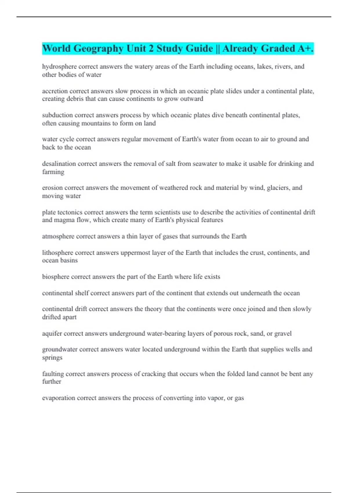 hydrosphere correct answers the watery areas of the Earth including oceans, lakes, rivers, and other bodies of water accretion correct answers slow process in which an oceanic plate slides under a continental plate, creating debris that can cause continents to grow outward subduction correct answers process by which oceanic plates dive beneath continental plates, often causing mountains to form on land water cycle correct answers regular movement of Earth's water from ocean to air to ground and back to the ocean desalination correct answers the removal of salt from seawater to make it usable for drinking and farming erosion correct answers the movement of weathered rock and material by wind, glaciers, and moving water plate tectonics correct answers the term scientists use to describe the activities of continental drift and magma flow, which create many of Earth's physical features atmosphere correct answers a thin layer of gases that surrounds the Earth lithosphere correct answers uppermost layer of the Earth that includes the crust, continents, and ocean basins biosphere correct answers the part of the Earth where life exists continental shelf correct answers part of the continent that extends out underneath the ocean continental drift correct answers the theory that the continents were once joined and then slowly drifted apart aquifer correct answers underground water-bearing layers of porous rock, sand, or gravel groundwater correct answers water located underground within the Earth that supplies wells and springs faulting correct answers process of cracking that occurs when the folded land cannot be bent any further evaporation correct answers the process of converting into vapor, or gas