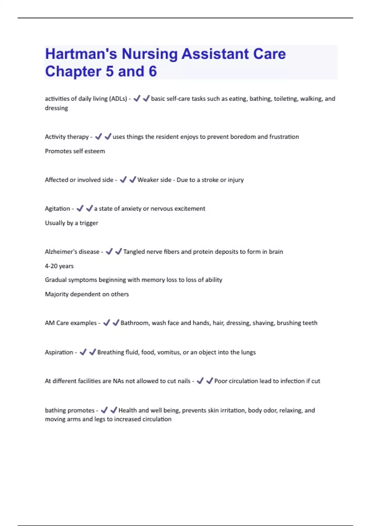 activities of daily living (ADLs) - basic self-care tasks such as eating, bathing, toileting, walking, and dressing Activity therapy - uses things the resident enjoys to prevent boredom and frustration Promotes self esteem Affected or involved side - Weaker side - Due to a stroke or injury Agitation - a state of anxiety or nervous excitement Usually by a trigger Alzheimer's disease - Tangled nerve fibers and protein deposits to form in brain 4-20 years Gradual symptoms beginning with memory loss to loss of ability Majority dependent on others AM Care examples - Bathroom, wash face and hands, hair, dressing, shaving, brushing teeth Aspiration - Breathing fluid, food, vomitus, or an object into the lungs At different facilities are NAs not allowed to cut nails - Poor circulation lead to infection if cut bathing promotes - Health and well being, prevents skin irritation, body odor, relaxing, and moving arms and legs to increased circulationBefore performing a task, NA should... - Explain what they will be doing Ask for Bathroom first Privacy Look for any problems Communication - small notepad in case Check environment Don't rush Clean up Lowest position