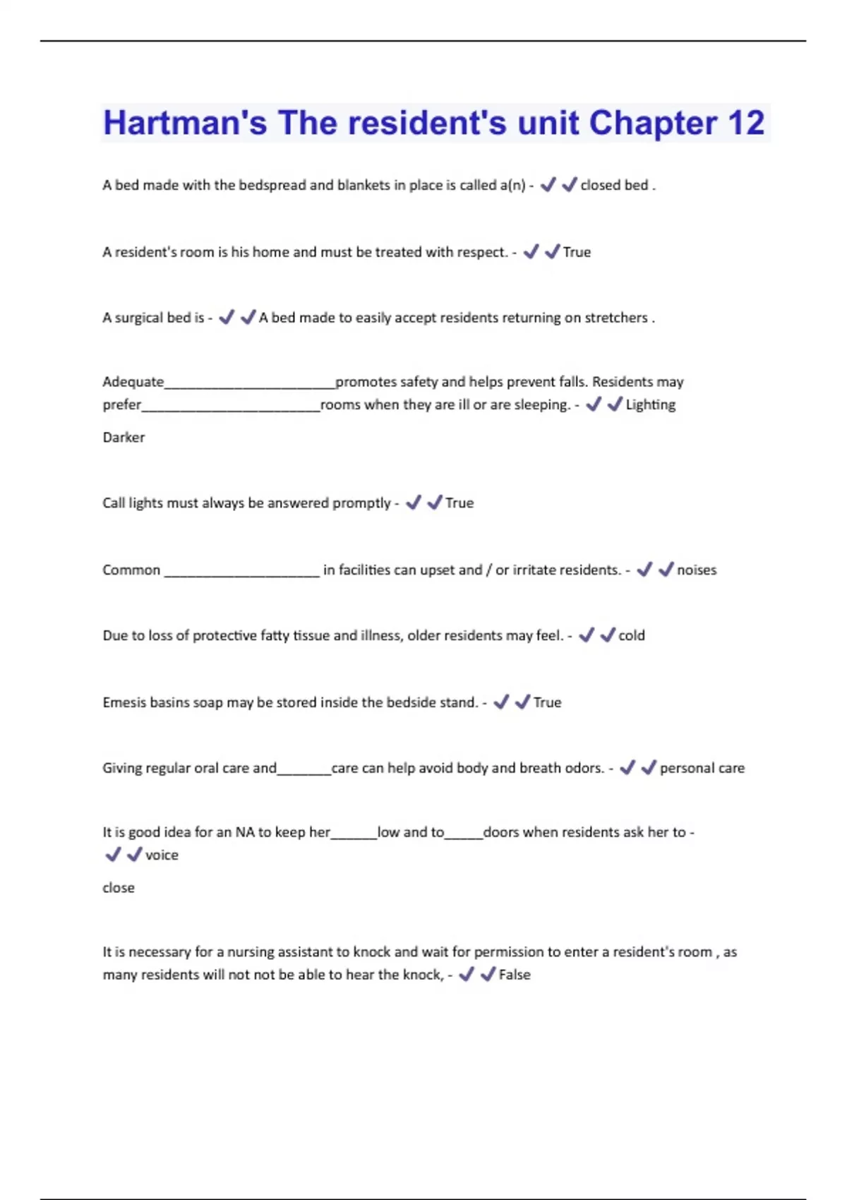 A bed made with the bedspread and blankets in place is called a(n) - closed bed . A resident's room is his home and must be treated with respect. - True A surgical bed is - A bed made to easily accept residents returning on stretchers . Adequate______________________promotes safety and helps prevent falls. Residents may prefer_______________________rooms when they are ill or are sleeping. - Lighting Darker Call lights must always be answered promptly - True Common ____________________ in facilities can upset and / or irritate residents. - noises Due to loss of protective fatty tissue and illness, older residents may feel. - cold Emesis basins soap may be stored inside the bedside stand. - True Giving regular oral care and_______care can help avoid body and breath odors. - personal care It is good idea for an NA to keep her______low and to_____doors when residents ask her to - voice close It is necessary for a nursing assistant to knock and wait for permission to enter a resident's room , as many residents will not not be able to hear the knock, - FalseNursing assistant should not________ equipment or meal trays - bang Soiled linen she be bagged - At the point of origin To control odors, an NA should clean up after episodes of ____________ and change incontinence_________ as soon as they are soiled. - urinals emesis To help residents stay comfortable, the Na should____________________clothes and bed covers for warmth and keep Residents_________________________________during personal care. - layer coverd Urinals and bedpans may be stored on top of the over bed table. - False When a resident cannot get out of bed - The bed should be raised to a safe height before making it . When removing dirty linen, the NA should - Roll it so that the soiled area is inside.