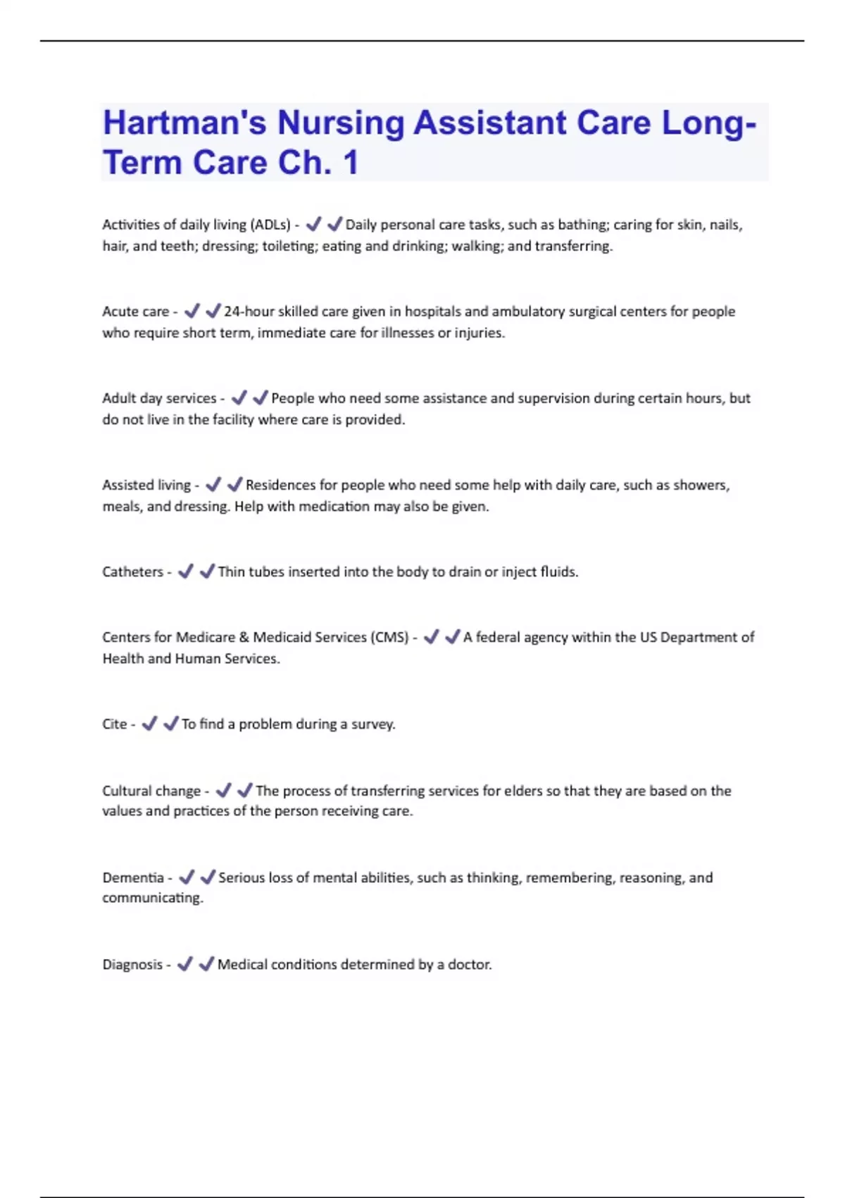 Hartman's Nursing Assistant Care Long-Term Care Ch. 1 Updated 2024/2025 Actual Questions and answers with complete solutions