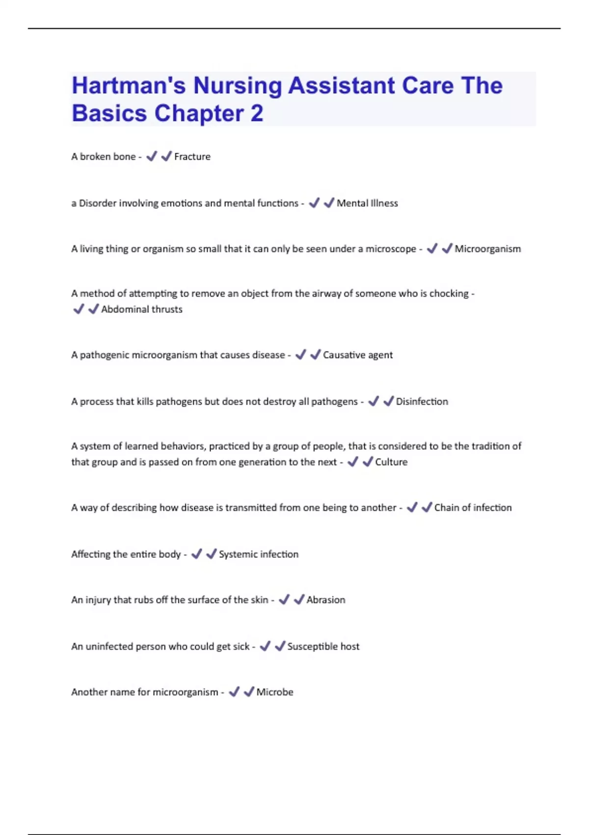 A broken bone - Fracture a Disorder involving emotions and mental functions - Mental Illness A living thing or organism so small that it can only be seen under a microscope - Microorganism A method of attempting to remove an object from the airway of someone who is chocking - Abdominal thrusts A pathogenic microorganism that causes disease - Causative agent A process that kills pathogens but does not destroy all pathogens - Disinfection A system of learned behaviors, practiced by a group of people, that is considered to be the tradition of that group and is passed on from one generation to the next - Culture A way of describing how disease is transmitted from one being to another - Chain of infection Affecting the entire body - Systemic infection An injury that rubs off the surface of the skin - Abrasion An uninfected person who could get sick - Susceptible host Another name for microorganism - MicrobeAny body opening on an infected person that allows pathogens to leave - Portal of exit Any body opening on an uninfected person that allows pathogens to enter - Portal of entry Based on what a person sees, hears, touches, or smells - Objective information Blue tinged skin - Cyanotic Burns caused by hot liquids - Scalds Centers for disease control and prevention. Under the DOH and HHS - CDC Cerebrovascular accident or stroke; occurs when blood supply to a part of the brain ids blocked or a blood vessel leaks or ruptures within the brain - CVA Cleaning measure that destroys all microorganisms including pathogens - Sterilization Clostridium difficile; Spore forming bacterium which can be part of the normal intestinal flora causing very watery diarrhea - C.diff Clutter, throw rugs, electrical cords, slippery or wet floors, uneven floors of stairs, poor lighting, call lights out of reach or not promptly answered - Risk factors for falls Diabetic Ketoacidosis - Caused by hyperglycemia. S&S include increased thirst and/or urination, abdominal pain, deep or labored breathing, breath smells fruity, headache, rapid pulse, dry skin, flushed cheeks, nausea and vomiting - DKA Difficulty breathing - DyspneaHarmful microorganism, invade the body and multiply and cause infection - Pathogen Healthcare associated infection; acquired in the healthcare setting during the delivery of medical care - HAI How the pathogen travels - Mode of transmission Inflammation of the liver caused by certain viruses and other factors, such as alcohol abuse, some medications, and trauma - Hepatitis