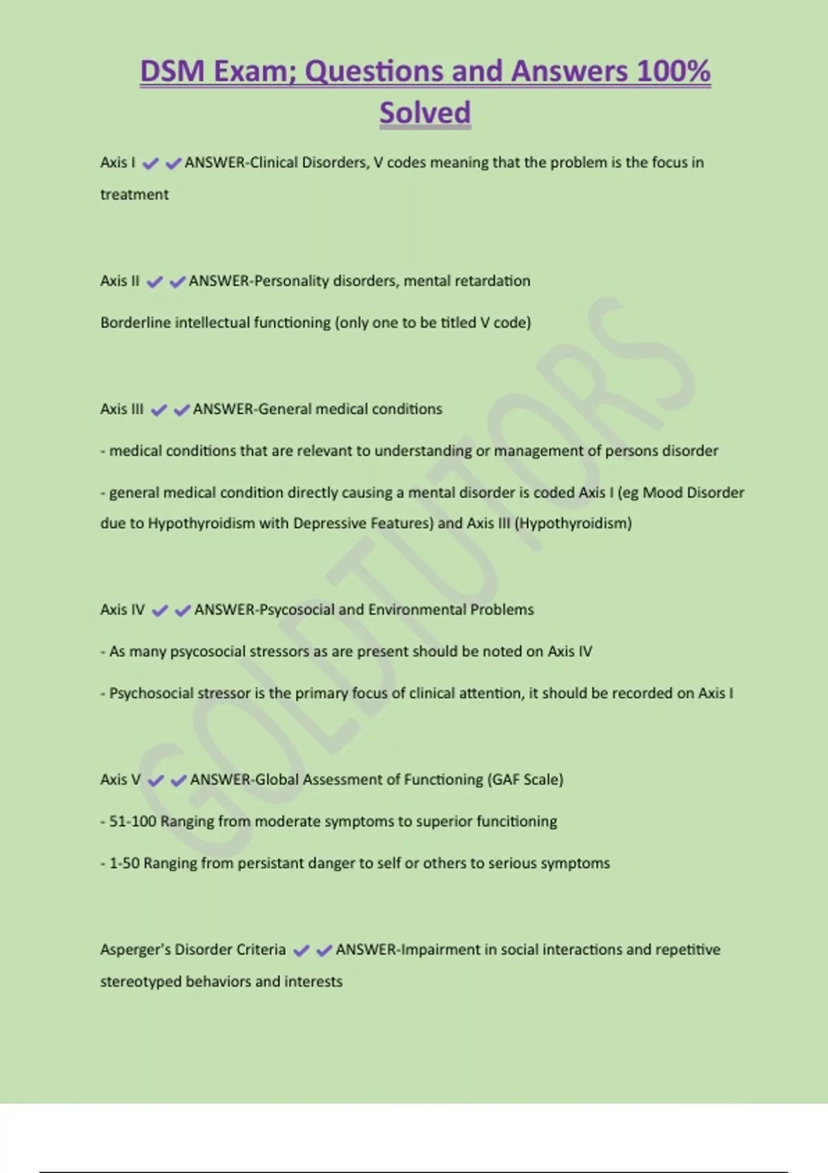 DSM Exam; Questions and Answers 100% Solved Axis I ANSWER-Clinical Disorders, V codes meaning that the problem is the focus in treatment Axis II ANSWER-Personality disorders, mental retardation Borderline intellectual functioning (only one to be titled V code) Axis III ANSWER-General medical conditions - medical conditions that are relevant to understanding or management of persons disorder - general medical condition directly causing a mental disorder is coded Axis I (eg Mood Disorder due to Hypothyroidism with Depressive Features) and Axis III (Hypothyroidism)