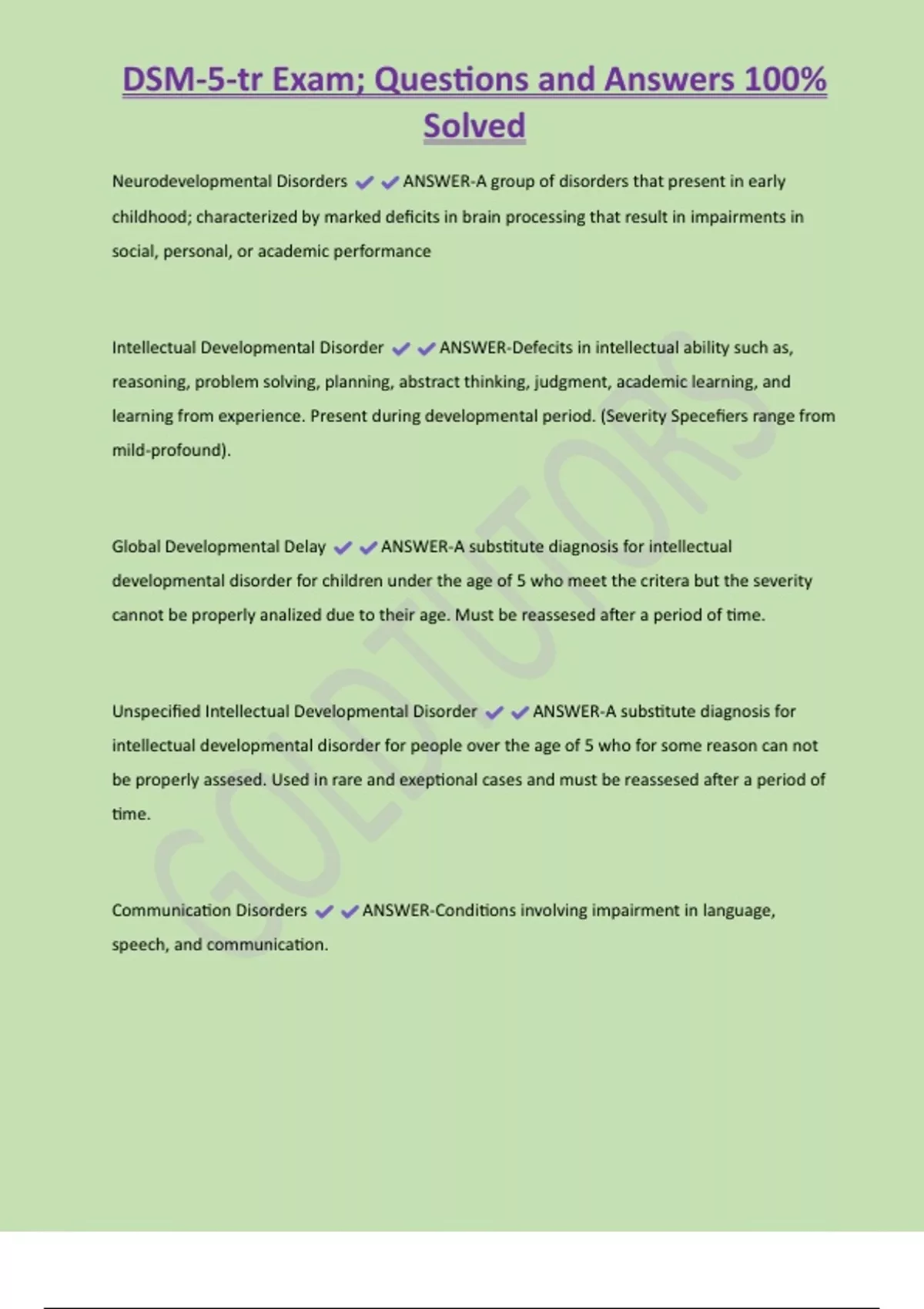 DSM-5-tr Exam; Questions and Answers 100% Solved Neurodevelopmental Disorders ANSWER-A group of disorders that present in early childhood; characterized by marked deficits in brain processing that result in impairments in social, personal, or academic performance Intellectual Developmental Disorder ANSWER-Defecits in intellectual ability such as, reasoning, problem solving, planning, abstract thinking, judgment, academic learning, and learning from experience. Present during developmental period. (Severity Specefiers range from mild-profound).