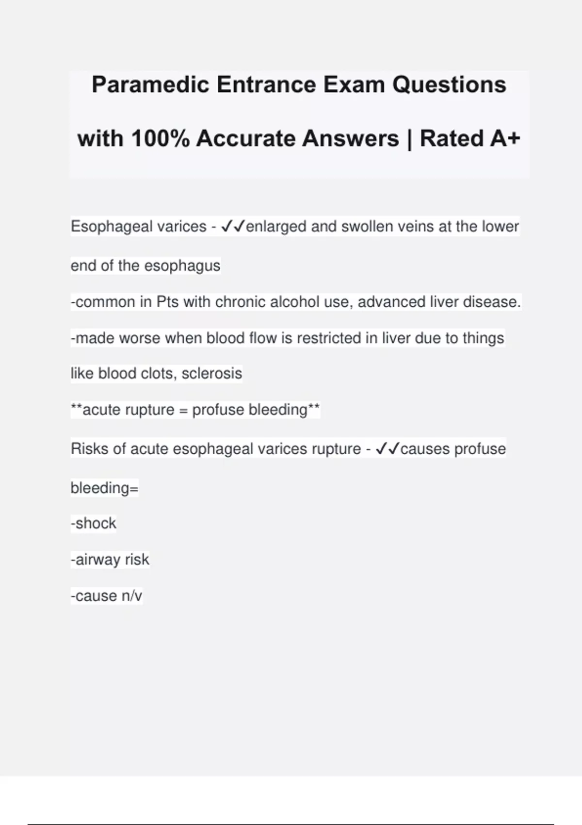Paramedic Entrance Exam Questions with 100% Accurate Answers | Rated A+ Esophageal varices - enlarged and swollen veins at the lower end of the esophagus -common in Pts with chronic alcohol use, advanced liver disease. -made worse when blood flow is restricted in liver due to things like blood clots, sclerosis **acute rupture = profuse bleeding** Risks of acute esophageal varices rupture - causes profuse bleeding= -shock -airway risk -cause n/v