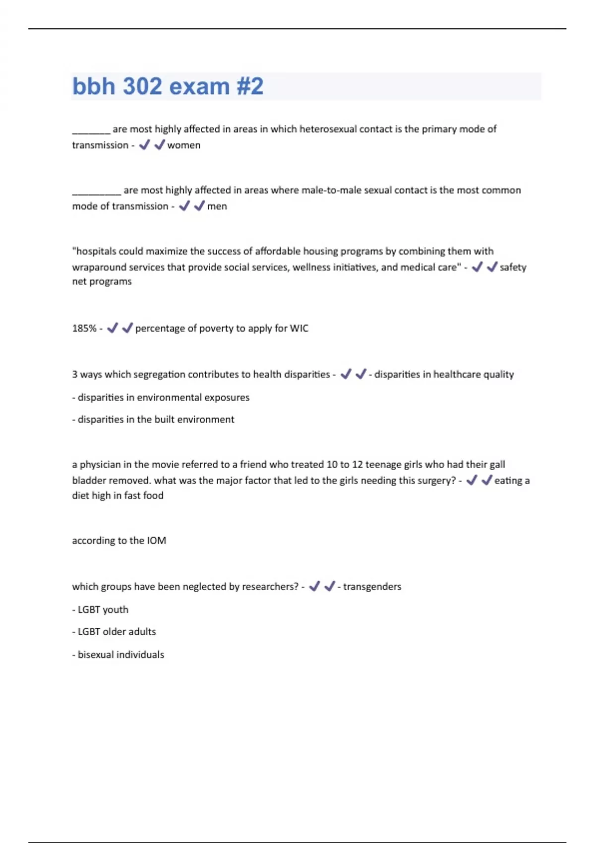 _______ are most highly affected in areas in which heterosexual contact is the primary mode of transmission - women _________ are most highly affected in areas where male-to-male sexual contact is the most common mode of transmission - men "hospitals could maximize the success of affordable housing programs by combining them with wraparound services that provide social services, wellness initiatives, and medical care" - safety net programs 185% - percentage of poverty to apply for WIC 3 ways which segregation contributes to health disparities - - disparities in healthcare quality - disparities in environmental exposures - disparities in the built environment a physician in the movie referred to a friend who treated 10 to 12 teenage girls who had their gall bladder removed. what was the major factor that led to the girls needing this surgery? - eating a diet high in fast food according to the IOM which groups have been neglected by researchers? - - transgenders - LGBT youth - LGBT older adults - bisexual individualsAfrican Americans who reach old age may be especially hardy and resilient. what describes this phenomia - the narrowing of life expectancy disparities at age 65 anal cancer (direct pathway) - if a person already has cancer and they experience discrimination, it could lead to depression/anxiety weak immune system could lead to poor health outcomes anal cancer (indirect pathway) - if you do not have a screening because a doctor does not want to treat you, you cannot prevent it at an earlier age which could then lead to poor health outcomes assets - liabilities - = net worth assumption of primary prevention - everyone has equal health care access (hospitals) leads to safety net programs and secondary prevention (clinics) medical care; tertiary prevention based on the health-wealth gradient, unemployment could influence illness and illness could influence unemployment - true centralization - situated near the city center (inner city) childhood housing conditions were associated with increased mortality in adulthood - true clustering - "ghettoization" or proximity complex activity limitation graph - people who can't move around successfully to fulfill their needsconcentration - population density of segregated group current federal minimum wage - $7.25/hr differences - can be explained using biology dimensions of residential segregation - - dissi
