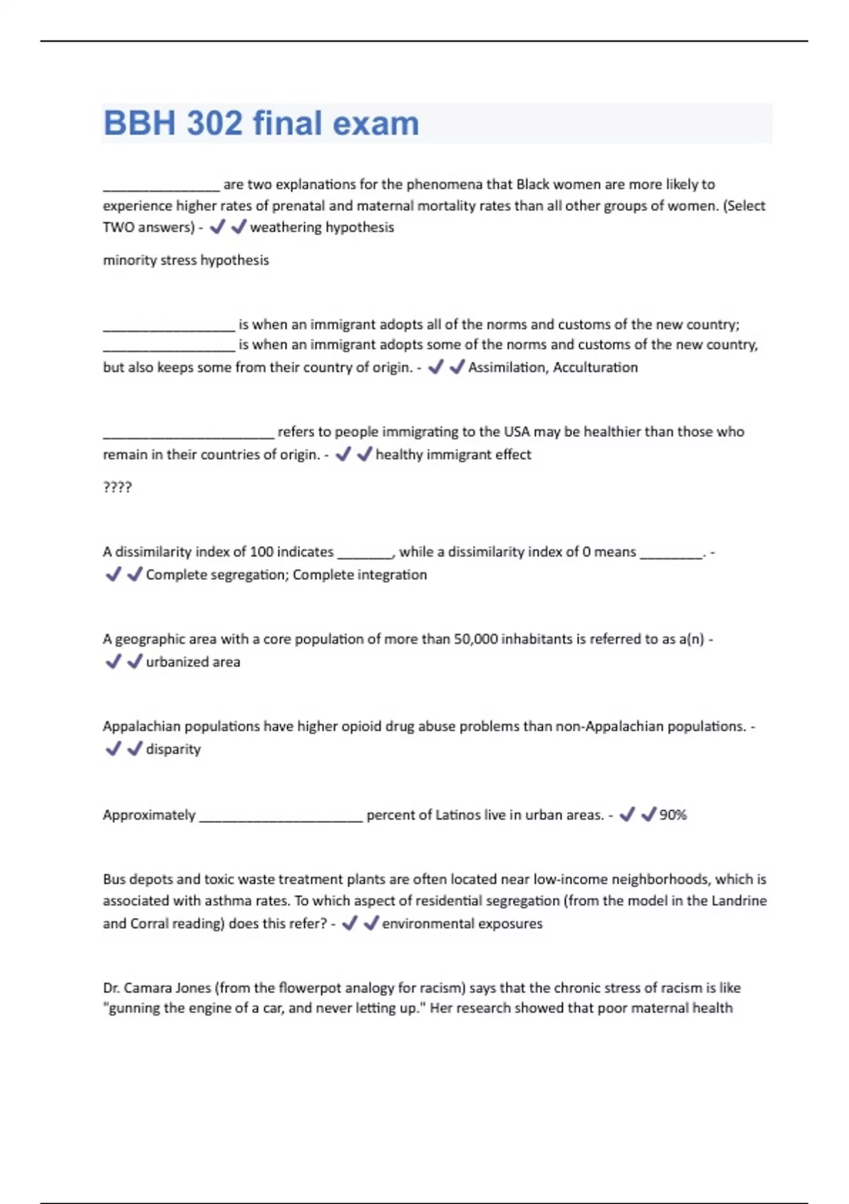 _______________ are two explanations for the phenomena that Black women are more likely to experience higher rates of prenatal and maternal mortality rates than all other groups of women. (Select TWO answers) - weathering hypothesis minority stress hypothesis _________________ is when an immigrant adopts all of the norms and customs of the new country; _________________ is when an immigrant adopts some of the norms and customs of the new country, but also keeps some from their country of origin. - Assimilation, Acculturation ______________________ refers to people immigrating to the USA may be healthier than those who remain in their countries of origin. - healthy immigrant effect ???? A dissimilarity index of 100 indicates _______, while a dissimilarity index of 0 means ________. - Complete segregation; Complete integration A geographic area with a core population of more than 50,000 inhabitants is referred to as a(n) - urbanized area Appalachian populations have higher opioid drug abuse problems than non-Appalachian populations. - disparity Approximately _____________________ percent of Latinos live in urban areas. - 90% Bus depots and toxic waste treatment plants are often located near low-income neighborhoods, which is associated with asthma rates. To which aspect of residential segregation (from the model in the Landrine and Corral reading) does this refer? - environmental exposures Dr. Camara Jones (from the flowerpot analogy for racism) says that the chronic stress of racism is like "gunning the engine of a car, and never letting up." Her research showed that poor maternal healthoutcomes in Black women in the U.S. are the result of the negative impact of racism _____________________________. - experienced over a lifetimeWhich of the following are the leading causes of DEATH in Hispanic populations? Select all that apply. For American Indians/Alaska Natives, apart from loss of land, income and food access because of reduced agriculture, ______________ was also discussed as a major determinant of health disparities in this population. - loss of culture For Native American tribes (shown in the video Bad Sugar), in an attempt to combat the hunger that followed after the dam was built on the Gila rive, the U.S. Government began to supply commodity foods to the population, which had a direct impact on diabetes rates for American Indian groups. This type of racism is an example of an act of ______________. - institutional racism For which 2 populations are disparities in mental illness (leading to higher suicide rates) greatest? - native populations and whites From the Health in All Policies Approach model, ________________ is the process of engaging communities in the research process in order to improve the development of relevant interventions. - community based participatory research Helicobacter Pylori (H. pylori) infection is a risk factor for stomach cancer. H. pylori infection is highly prevalent in India and Thailand, however, stomach cancer rates are low in these countries. This is referred to as the: - asian enigma Hispanics face health disparities due to some unique exposures: choose all that apply - high rates of agricultural work high rates of urbanization high percentage of migrant farm workers Hospitals in residentially-segregated communities have fewer board certified specialists than hospitals in non-segregated communities. - inequity or disparityHousehold income and education --> children's educational attainment --> future employment opportunities --> health insurance coverage --> lack of preventative care --> poor health --> lower household ____________ and ______________. Fill in the gaps & what is this model is referred to: - income & education; the cycle of poverty How many Native American tribes are recognized by the Federal Government? - 560 In 2011, Black women account for 42% of all the pregnancy-related deaths in the US, while White women account for only 12.5%. - disparity In class, we reviewed a New York Times article that showed socioeconomic outcomes for White and Black boys who grew up in rich households. The image below shows striking (and sobering) inequities in income in adulthood. From the lecture on socioeconomic disparities, what does this illustrate? - the generational racial gap in wealth In general, your zip code is a poor predictor of your health. - false In the CLIFF MODEL, eating a healthy diet and exercising to prevent hypertension is an example of: - the fence In the CLIFF MODEL, pacemaker surgery is an example of: - the ambulance In the Cycle of Poverty model, exposures refers to which of the following? Choose all that apply. - - parents ability to cover the costs of preventative medical and dental care - housing quality, neighborhood safety - access to amenities like parks, walking paths, and full-service grocery stores Indigenous land created wealth for all of the land grant institutions of higher education through land cessation, land seizures without compensation, and broken treaties with Native American tribes. ____________________ land comes from more than 112 tribes across 16 states and resulted in more than $439,000 in profit—about $7.8 million, when adjusted for inflation. . This institution currently sitson land formerly owned and occupied by the Erie, Haudenosaunee, Lenni Lenape, Shawnee, Susquehannock tribes. - Penn State Landrine & Corral (2009) The Landrine and Corral (2009) reading used the dissimilarity or segregation index to describe pathways to Black health disparities...we can think about effects on any group living in residentially segregated areas. The authors described 3 separate DIRECT pathways by which residential segregation can impact health disparities. Choose all that apply below. - - disparities in built environments - disparities in healthcare quality - disparities in environmental exposures Lower rates of kidney transplants in low-income, minority patients is an act of: - omission Lung cancer rates are hig