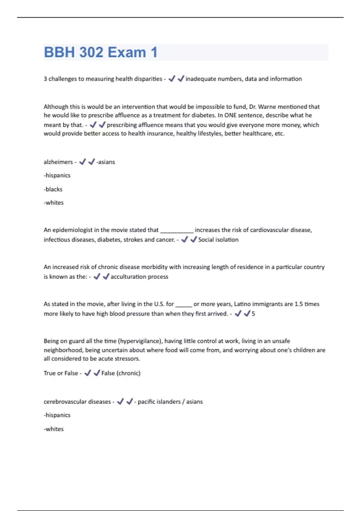 3 challenges to measuring health disparities - inadequate numbers, data and information Although this is would be an intervention that would be impossible to fund, Dr. Warne mentioned that he would like to prescribe affluence as a treatment for diabetes. In ONE sentence, describe what he meant by that. - prescribing affluence means that you would give everyone more money, which would provide better access to health insurance, healthy lifestyles, better healthcare, etc. alzheimers - -asians -hispanics -blacks -whites An epidemiologist in the movie stated that __________ increases the risk of cardiovascular disease, infectious diseases, diabetes, strokes and cancer. - Social isolation An increased risk of chronic disease morbidity with increasing length of residence in a particular country is known as the: - acculturation process As stated in the movie, after living in the U.S. for _____ or more years, Latino immigrants are 1.5 times more likely to have high blood pressure than when they first arrived. - 5 Being on guard all the time (hypervigilance), having little control at work, living in an unsafe neighborhood, being uncertain about where food will come from, and worrying about one's children are all considered to be acute stressors. True or False - False (chronic) cerebrovascular diseases - - pacific islanders / asians -hispanics -whites-blacks - american indian / alaskan natives chronic liver disease/ cirrhosis - -hispanics - american indian / alaskan natives chronic lower respiratory diseases - -pacific islanders / asians -hispanics -blacks -whites - american indian / alaskan natives cultrually appropriate - providing the best possible health care based on cultural background and needs cultural competence - an understanding of attention to the client's total situation culturally sensitive - knowledge and constructive attitudes towards the diverse health traditions of cultural groups being served diabetes - - native hawaiian / pacific islanders - pacific islanders / asians -hispanics - blacks -whites - american indian / alaskan natives Diseases of the Heart - -native hawaiian/ pacific islanders (number 1 leading cause of death) -pacific islanders/ asians-hispanics -blacks (number 1 leading cause of death) -whites (number 1 leading cause of death) - american indian / alaskan natives (number 1 leading cause of death) Dr. Iton stated that the relationship between health and wealth is relatively loose for new immigrants. What did he mean by this? - " He means that new latino immigrants, even if they are from low SES have better health that wealthy people from US.However the health-wealth relationship becomes tighter as the years pass." excess deaths - difference in death rate observed in one racial group compared to that of nonhispanic, white population Explain the four major barriers to health and explain - 1. lack of access to health services 2. lack of health insurance "fear of public charge" 3. language barriers 4. cultural ignorance health - wealth gradiant - as wealth increases, so does health Health Disparities in American Indians / Alaskan Natives - sudden infant death syndrome (SIDS) infant mortality chronic liver disease/ cirrhosis diabetes mortality unintentional injuries suicide decrease in prenatal care increase in smoking during pregnancy fetal alcohol syndrom domestic violencealcoholism and substance abuse homicide (2nd highest) TB obesity other mental health problems