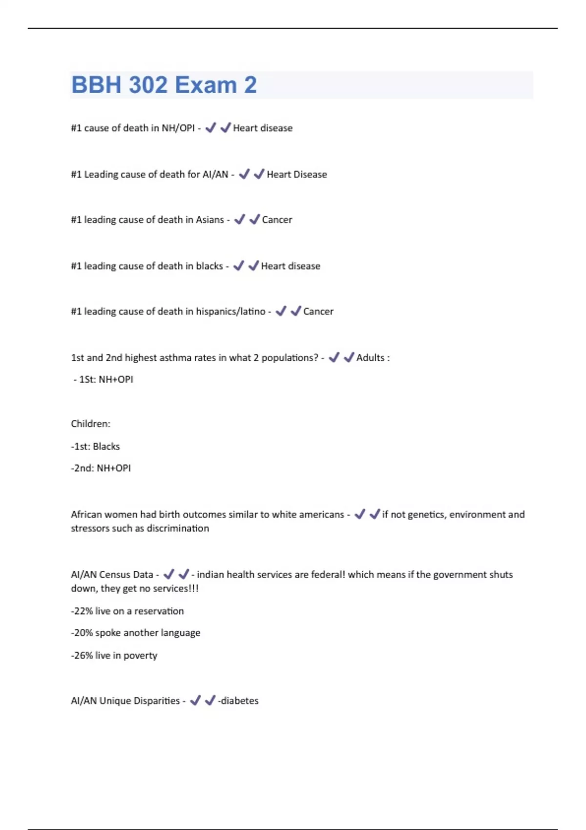 #1 cause of death in NH/OPI - Heart disease #1 Leading cause of death for AI/AN - Heart Disease #1 leading cause of death in Asians - Cancer #1 leading cause of death in blacks - Heart disease #1 leading cause of death in hispanics/latino - Cancer 1st and 2nd highest asthma rates in what 2 populations? - Adults : - 1St: NH+OPI Children: -1st: Blacks -2nd: NH+OPI African women had birth outcomes similar to white americans - if not genetics, environment and stressors such as discrimination AI/AN Census Data - - indian health services are federal! which means if the government shuts down, they get no services!!! -22% live on a reservation -20% spoke another language -26% live in poverty AI/AN Unique Disparities - -diabetes-infant mortality -alcoholism Amenable Deaths - Avoidable deaths that could be prevented if individuals received adequate and timely health care Amenable Deaths - Avoidable deaths that could be prevented if individuals received adequate and timely health care Apart for AI/AN men in the Southwest, AI/AN men and women were more likely to be tested for HIV than Whites. - TRUE Asian are low in what cancer? - Low breast cancer and low rates of screening Asian Enigma - paradox in low rates of gastric (stomach) cancer in certain parts of Asia, despite high rates of Helicobacter Pylori infection, which increases the risk of gastric cancer Asian Enigma - The paradox of low rates of gastric (stomach) cancer in certain parts of Asia, despite high rates of H. pylori infection, which increases risk of gastric cancer Asian Paradox - - Leading cause of death is cancer, but when compared to other groups, it has the lowest rates -good birthing outcomes, but low levels of prenatal care Asian Paradox - Good outcomes in breast cancer, despite low rates of mammograms Good birth outcomes, despite low levels of prenatal care Asians and Screening - lowest ratesBlack Paradox - -prostate cancer: high screening -Breast cancer: high screening, but at later stage Breast cancer rates were lower in Hispanic/Latina woemen, despite: - Lower rates of mammography use Cancer Incidence is higher in whites, but mortality is higher in Blacks - TRUE - It's not because they dont get screened, it is because blacks get screened too late - also a tumor specific to black population that is very aggressive when untreated Community-based participatory research - the process of engaging communities in the research process in order to improve the development of relevant interventions Despite lower rates of alcohol uses, which of the following was higher in Hispanic/Latino populations? - Liver Disease - Hep B might explain these rates Disempowerment - Efforts to derive of power, authority, or influence: make weak, ineffectual or unimportant. Similar to marginalization Disempowerment - to deprive of power, authority, or influence: make weak, ineffectual, or unimportant Drug Overdose - 1st: 2nd: AI/AN Elevated waist circumference, elevated triglycerides, reduced high-density lipoprotein-C, elevated blood pressure, and elevated fasting glucose are criteria used to diagnose __________________, for which Hispanic populations are at high risk. -Factors such as macroeconomics, cultural values, socioeconomic status, and social support are known as: - Social Determinants of Health Foreign born Asians fair far worse in terms of TB than US born Asians - True