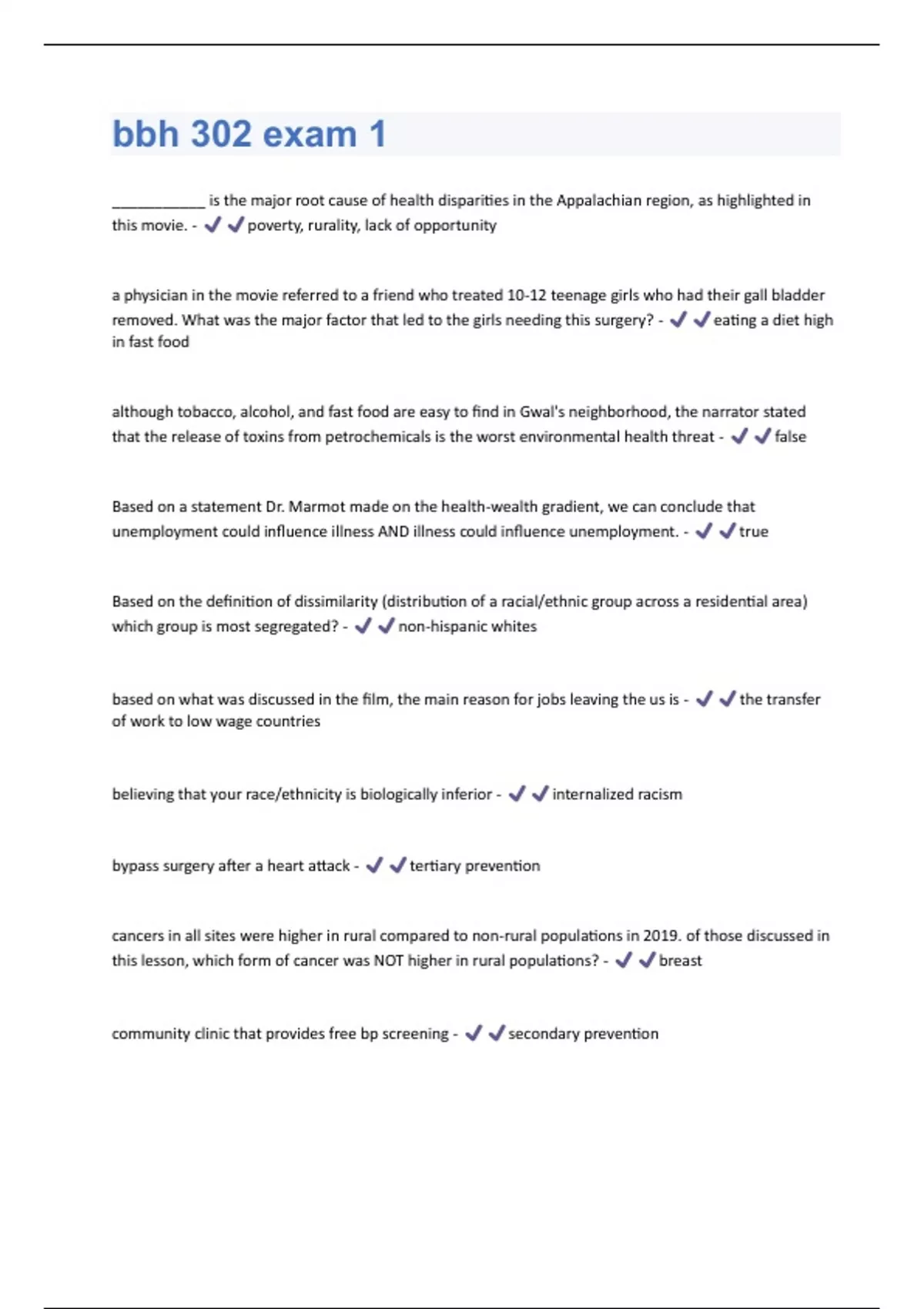 ___________ is the major root cause of health disparities in the Appalachian region, as highlighted in this movie. - poverty, rurality, lack of opportunity a physician in the movie referred to a friend who treated 10-12 teenage girls who had their gall bladder removed. What was the major factor that led to the girls needing this surgery? - eating a diet high in fast food although tobacco, alcohol, and fast food are easy to find in Gwal's neighborhood, the narrator stated that the release of toxins from petrochemicals is the worst environmental health threat - false Based on a statement Dr. Marmot made on the health-wealth gradient, we can conclude that unemployment could influence illness AND illness could influence unemployment. - true Based on the definition of dissimilarity (distribution of a racial/ethnic group across a residential area) which group is most segregated? - non-hispanic whites based on what was discussed in the film, the main reason for jobs leaving the us is - the transfer of work to low wage countries believing that your race/ethnicity is biologically inferior - internalized racism bypass surgery after a heart attack - tertiary prevention cancers in all sites were higher in rural compared to non-rural populations in 2019. of those discussed in this lesson, which form of cancer was NOT higher in rural populations? - breast community clinic that provides free bp screening - secondary preventiondr. brenner stated that there is an association between unemployment and health, and that changes usually occur over a ... period - 10-year Dr. Williams talked about health policy. Select all of the following that are true about what he referred to as health policy. - housing policy, educational policy, anti-violence policy, neighborhood improvement policies eating a healthy diet - primary prevention for a majority of diseases and conditions that were reviewed in this lesson, there was a stair-step association between health and measures of socioeconomic status. For which disease was this stair-step pattern not seen? - cancer for the association between children's health and SES, which measures were most commonly used to assess SES? - parents' income and education having access to chain supermarkets increases one's access to fruits and vegetables at lower prices - true how do the authors suggest correcting health disparities - implementing policies In Sweden, the association between health and wealth is most likely TIGHT. That is, they likely see a similar health-wealth gradient that we see here in the U.S. - false in the NYT article that described the results of a study on social class in adulthood for black and white boys raised in rich families, what was the general conclusion - black boys raised in rich families were far LESS likely to become a rich adult, compared to white boys in what area of the us has there been an increase in the prevalence of CWP in the last 20 years - central appalachiaminorities often receive health care at lower-quality, lower-resource health clinics close to their homes. this is an example of which level of racism? - institutionalized neglecting to refer a patient for a needed diagnostic test is an example of an act of - omission not having interpreters in areas in which there is a large prevalence of immigrants from china is an example of what type of racism? - institutionalized not referring people of color for diagnostic medical tests - personally-mediated racism one limitation of the braveman study is that, due to measurement error, the size of health disparities between groups may be even greater than indicated - true one of the major explanations for residential segregation is the fact that blacks prefer to live in black neighborhoods - false
