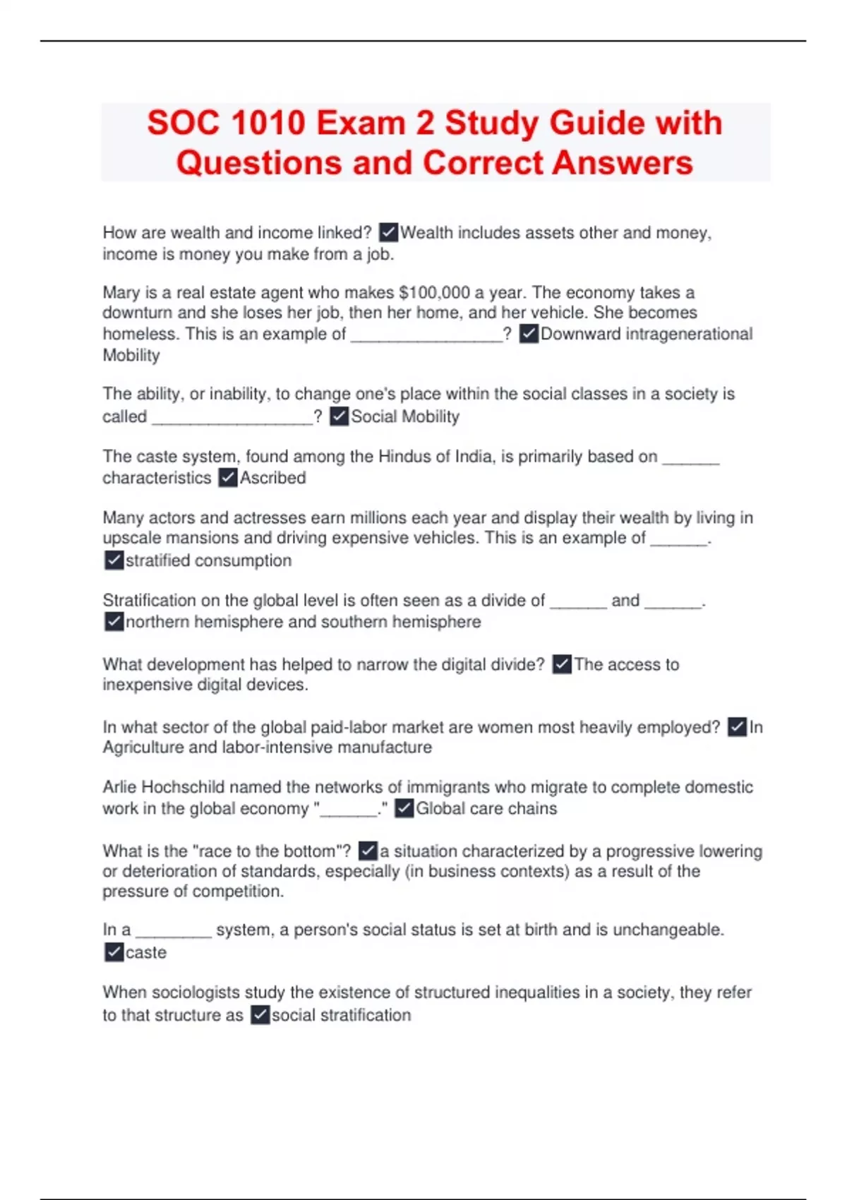 SOC 1010 Exam 2 Study Guide with Questions and Correct Answers