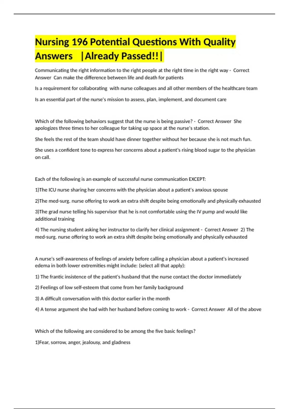 Communicating the right information to the right people at the right time in the right way - Correct Answer Can make the difference between life and death for patients Is a requirement for collaborating with nurse colleagues and all other members of the healthcare team Is an essential part of the nurse's mission to assess, plan, implement, and document care Which of the following behaviors suggest that the nurse is being passive? - Correct Answer She apologizes three times to her colleague for taking up space at the nurse's station. She feels the rest of the team should have dinner together without her because she is not much fun. She uses a confident tone to express her concerns about a patient's rising blood sugar to the physician on call. Each of the following is an example of successful nurse communication EXCEPT: 1)The ICU nurse sharing her concerns with the physician about a patient's anxious spouse 2)The med-surg. nurse offering to work an extra shift despite being emotionally and physically exhausted 3)The grad nurse telling his supervisor that he is not comfortable using the IV pump and would like additional training 4) The nursing student asking her instructor to clarify her clinical assignment - Correct Answer 2) The med-surg. nurse offering to work an extra shift despite being emotionally and physically exhausted A nurse's self-awareness of feelings of anxiety before calling a physician about a patient's increased edema in both lower extremities might include: (select all that apply): 1) The frantic insistence of the patient's husband that the nurse contact the doctor immediately 2) Feelings of low self-esteem that come from her family background 3) A difficult conversation with this doctor earlier in the month 4) A tense argument she had with her husband before coming to work - Correct Answer All of the above Which of the following are considered to be among the five basic feelings? 1)Fear, sorrow, anger, jealousy, and gladness 2)Shame, fear, gladness, and anger 3)Anger, sorrow, surprise, fear 4)Sorrow, anger, shame, and annoyance - Correct Answer 1)Fear, sorrow, anger, jealousy, and gladness P