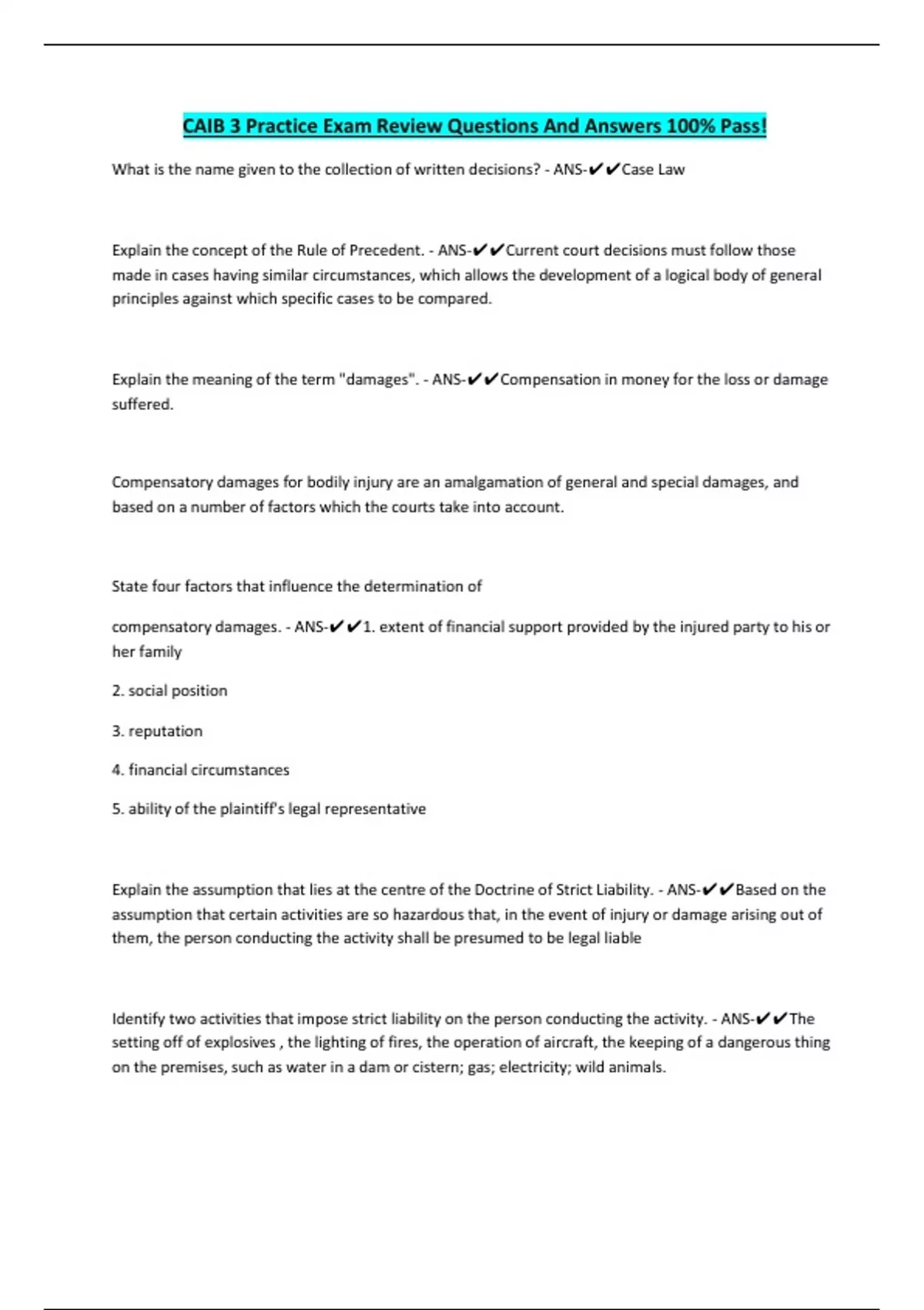 CAIB 3 Practice Exam Review Questions And Answers 100% Pass! What is the name given to the collection of written decisions? - ANS-Case Law Explain the concept of the Rule of Precedent. - ANS-Current court decisions must follow those made in cases having similar circumstances, which allows the development of a logical body of general principles against which specific cases to be compared. Explain the meaning of the term "damages". - ANS-Compensation in money for the loss or damage suffered. Compensatory damages for bodily injury are an amalgamation of general and special damages, and based on a number of factors which the courts take into account. State four factors that influence the determination of compensatory damages. - ANS-1. extent of financial support provided by the injured party to his or her family 2. social position 3. reputation 4. financial circumstances 5. ability of the plaintiff's legal representative Explain the assumption that lies at the centre of the Doctrine of Strict Liability. - ANS-Based on the assumption that certain activities are so hazardous that, in the event of injury or damage arising out of them, the person conducting the activity shall be presumed to be legal liable Identify two activities that impose strict liability on the person conducting the activity. - ANS-The setting off of explosives , the lighting of fires, the operation of aircraft, the keeping of a dangerous thing on the premises, such as water in a dam or cistern; gas; electricity; wild animals. What is the position of the defendant in a legal action when the law deems the defendant strictly liable? - ANS-