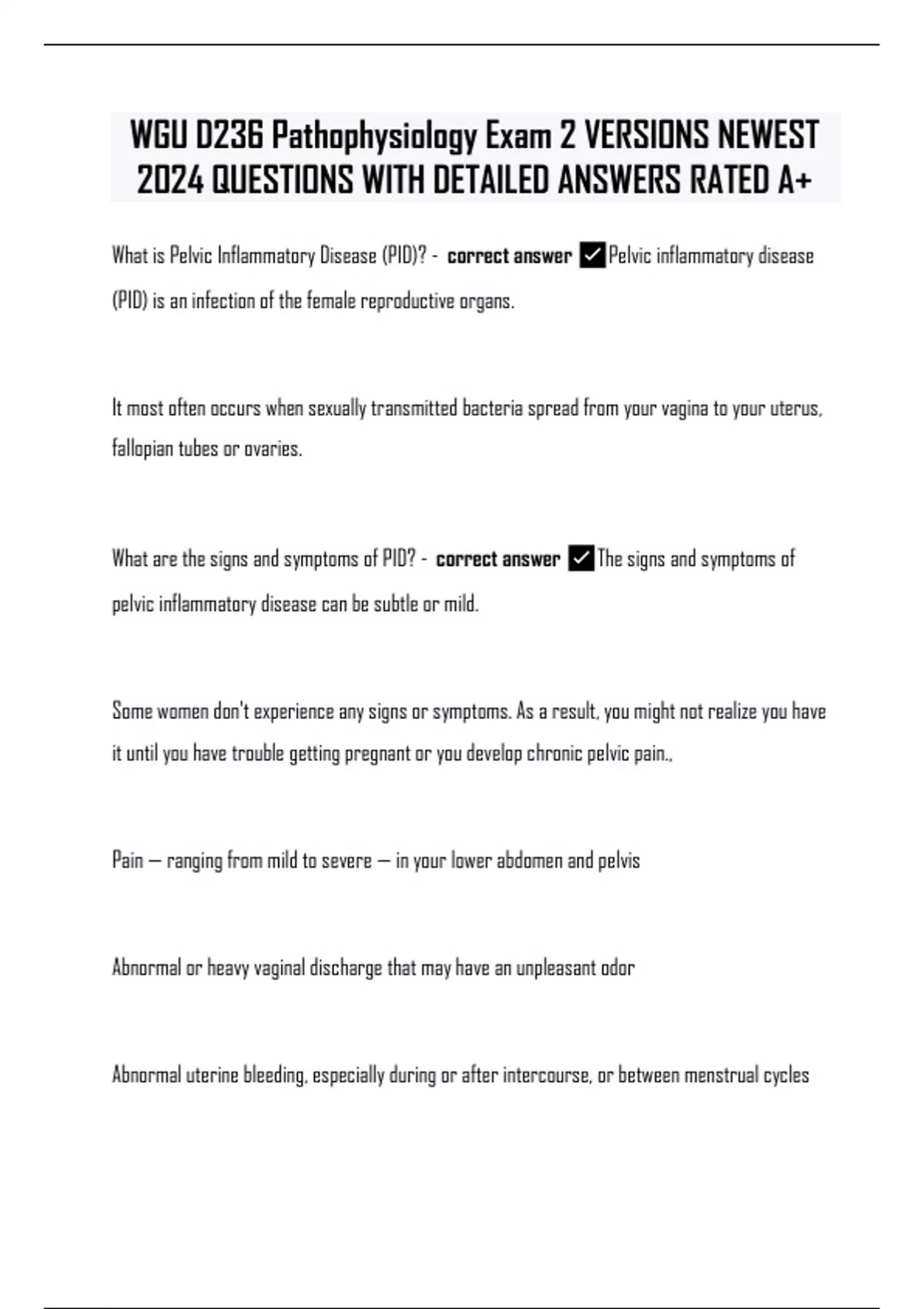 WGU D236 Pathophysiology Exam 2 VERSIONS NEWEST 2024 QUESTIONS WITH DETAILED ANSWERS RATED A+ What is Pelvic Inflammatory Disease (PID)? - correct answerPelvic inflammatory disease (PID) is an infection of the female reproductive organs. It most often occurs when sexually transmitted bacteria spread from your vagina to your uterus, fallopian tubes or ovaries. What are the signs and symptoms of PID? - correct answerThe signs and symptoms of pelvic inflammatory disease can be subtle or mild. Some women don't experience any signs or symptoms. As a result, you might not realize you have it until you have trouble getting pregnant or you develop chronic pelvic pain., Pain — ranging from mild to severe — in your lower abdomen and pelvis Abnormal or heavy vaginal discharge that may have an unpleasant odor Abnormal uterine bleeding, especially during or after intercourse, or between menstrual cycles Pain during intercourse Fever, sometimes with chills Painful, frequent or difficult urination What are the Causes of PID? - correct answerMany types of bacteria can cause PID, but gonorrhea or chlamydia infections are the most common. These bacteria are usually acquired during unprotected sex. Less commonly, bacteria can enter your reproductive tract anytime the normal barrier created by the cervix is disturbed. This can happen during menstruation and after childbirth, miscarriage or abortion. Rarely, bacteria can also enter the reproductive tract during the insertion of an intrauterine device (IUD) — a form of long-term birth control — or any medical procedure that involves inserting instruments into the uterus. What are the risk factors for PID? - correct answerRisk factors A number of factors might increase your risk of pelvic inflammatory disease, including: *Being a sexually active woman younger than 25 years old *Having multiple sexual partners *Being in a sexual relationship with a person who has more than one sex partner *Having sex without a condom *Douching regularly, which upsets the balance of good versus harmful bacteria in the vagina and might mask symptoms. *Having a history of pelvic inflammatory disease or a sexually transmitted infection. *There is a small increased risk of PID after the insertion of an intrauterine device (IUD). This risk is generally confined to the first three weeks after insertion