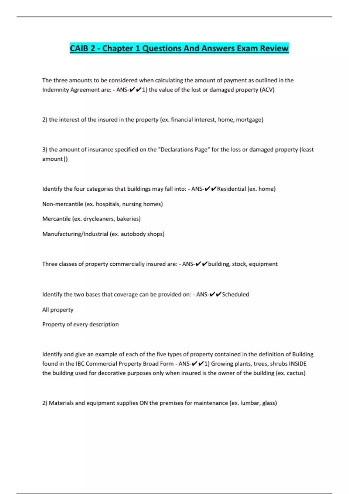 CAIB 2 - Chapter 1 Questions And Answers Exam Review The three amounts to be considered when calculating the amount of payment as outlined in the Indemnity Agreement are: - ANS-1) the value of the lost or damaged property (ACV) 2) the interest of the insured in the property (ex. financial interest, home, mortgage) 3) the amount of insurance specified on the "Declarations Page" for the loss or damaged property (least amount|) Identify the four categories that buildings may fall into: - ANS-Residential (ex. home) Non-mercantile (ex. hospitals, nursing homes) Mercantile (ex. drycleaners, bakeries) Manufacturing/Industrial (ex. autobody shops) Three classes of property commercially insured are: - ANS-building, stock, equipment Identify the two bases that coverage can be provided on: - ANS-Scheduled All property Property of every description Identify and give an example of each of the five types of property contained in the definition of Building found in the IBC Commercial Property Broad Form - ANS-1) Growing plants, trees, shrubs INSIDE the building used for decorative purposes only when insured is the owner of the building (ex. cactus) 2) Materials and equipment supplies ON the premises for maintenance (ex. lumbar, glass) Continues...