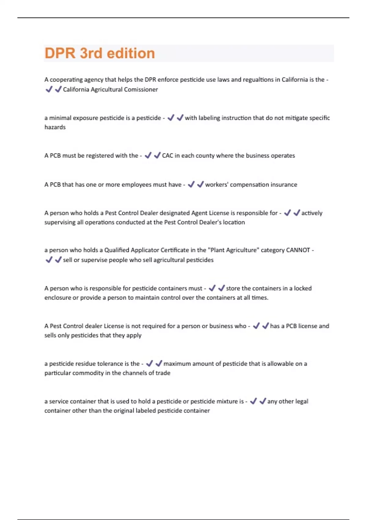A cooperating agency that helps the DPR enforce pesticide use laws and regualtions in California is the - California Agricultural Comissioner a minimal exposure pesticide is a pesticide - with labeling instruction that do not mitigate specific hazards A PCB must be registered with the - CAC in each county where the business operates A PCB that has one or more employees must have - workers' compensation insurance A person who holds a Pest Control Dealer designated Agent License is responsible for - actively supervising all operations conducted at the Pest Control Dealer's location a person who holds a Qualified Applicator Certificate in the "Plant Agriculture" category CANNOT - sell or supervise people who sell agricultural pesticides A person who is responsible for pesticide containers must - store the containers in a locked enclosure or provide a person to maintain control over the containers at all times. A Pest Control dealer License is not required for a person or business who - has a PCB license and sells only pesticides that they apply a pesticide residue tolerance is the - maximum amount of pesticide that is allowable on a particular commodity in the channels of trade a service container that is used to hold a pesticide or pesticide mixture is - any other legal container other than the original labeled pesticide containerA special local need registration allows - uses of pesticides for crops or sites not listed on the Section 3 labeling in the state it was used all employees who handle minimal exposure pesticides must have available to them - an area where they can change clothes and wash themselves at the end of their workday An agricultural Pest control advisor license is required if you - solicit pest control services or pesticide sales for agricultural uses an application for a restricted material permit for non-agricultural use must include the - criteria for determining the need for the pesticide applicaton an employee who mixes, loads, or applies pesticide with the signal word "DANGER" in the production of an agricultural commodity may work alone at night if the employee - makes personal contact by radio with a responsible adult at least every hour any emergency or accidental release of pesticides involving a PCB must be reported to the - CAC Any person in California who applies or supervises the application of a restricted material must - be a certified commercial or private applicator as used in the dormant spray contamination prevention regulation, a "hydrologically isolated site" is - any treatment area that does not produce pesticide run off that can enter any surface water such as in an irrigation canal or drainage ditch before a pest control business applies a pesticide for the production of an agricultural commodity, the operator of the property must provide the business with - their operator identification number