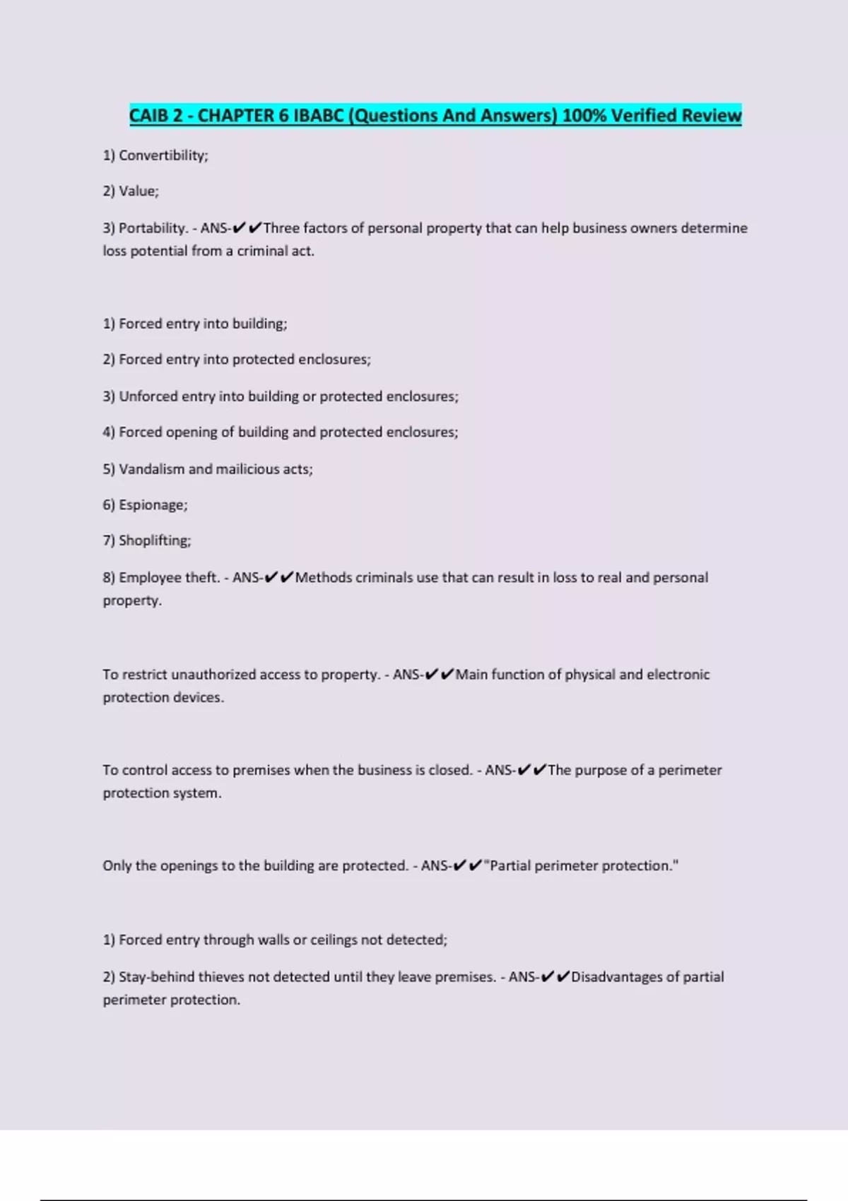 CAIB 2 - CHAPTER 6 IBABC (Questions And Answers) 100% Verified Review 1) Convertibility; 2) Value; 3) Portability. - ANS-Three factors of personal property that can help business owners determine loss potential from a criminal act. 1) Forced entry into building; 2) Forced entry into protected enclosures; 3) Unforced entry into building or protected enclosures; 4) Forced opening of building and protected enclosures; 5) Vandalism and mailicious acts; 6) Espionage; 7) Shoplifting; 8) Employee theft. - ANS-Methods criminals use that can result in loss to real and personal property. To restrict unauthorized access to property. - ANS-Main function of physical and electronic protection devices. To control access to premises when the business is closed. - ANS-The purpose of a perimeter protection system. Only the openings to the building are protected. - ANS-...