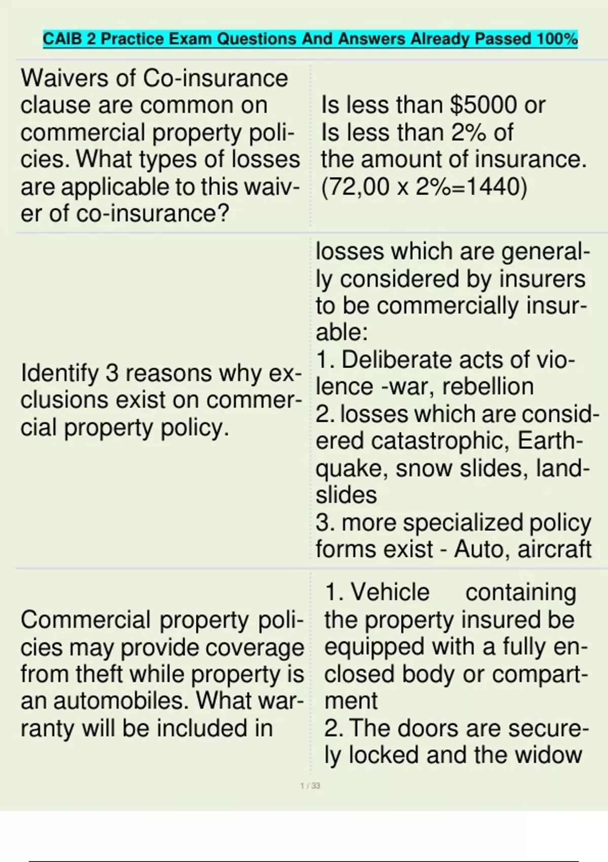 CAIB 2 Practice Exam Questions And Answers Already Passed 100% 1 / 33 Waivers of Co-insurance clause are common on commercial property policies. What types of losses are applicable to this waiver of co-insurance? Identify 3 reasons why exclusions exist on commercial property policy. Commercial property policies may provide coverage from theft while property is an automobiles. What warranty will be included in...