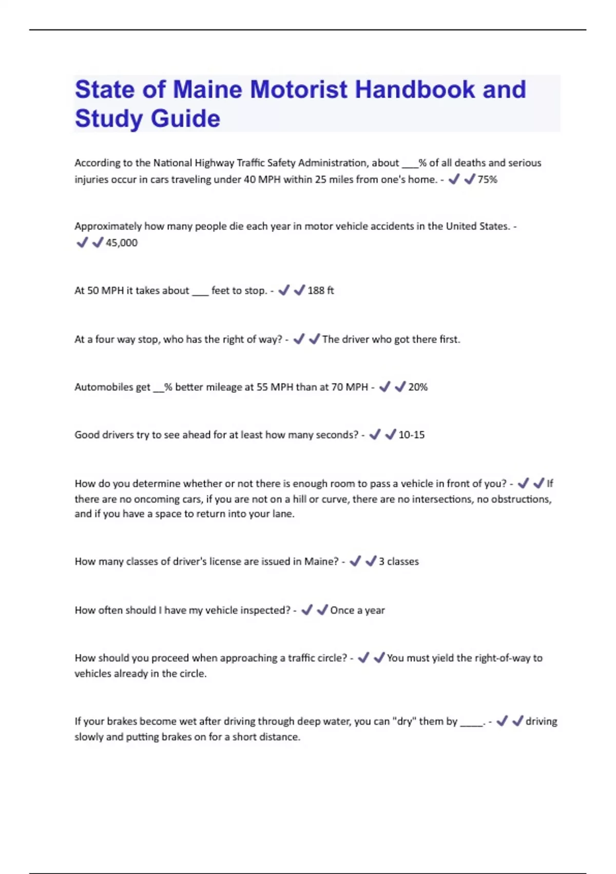 State of Maine Motorist Handbook and Study Guide Question with 100 % correct answers Verified