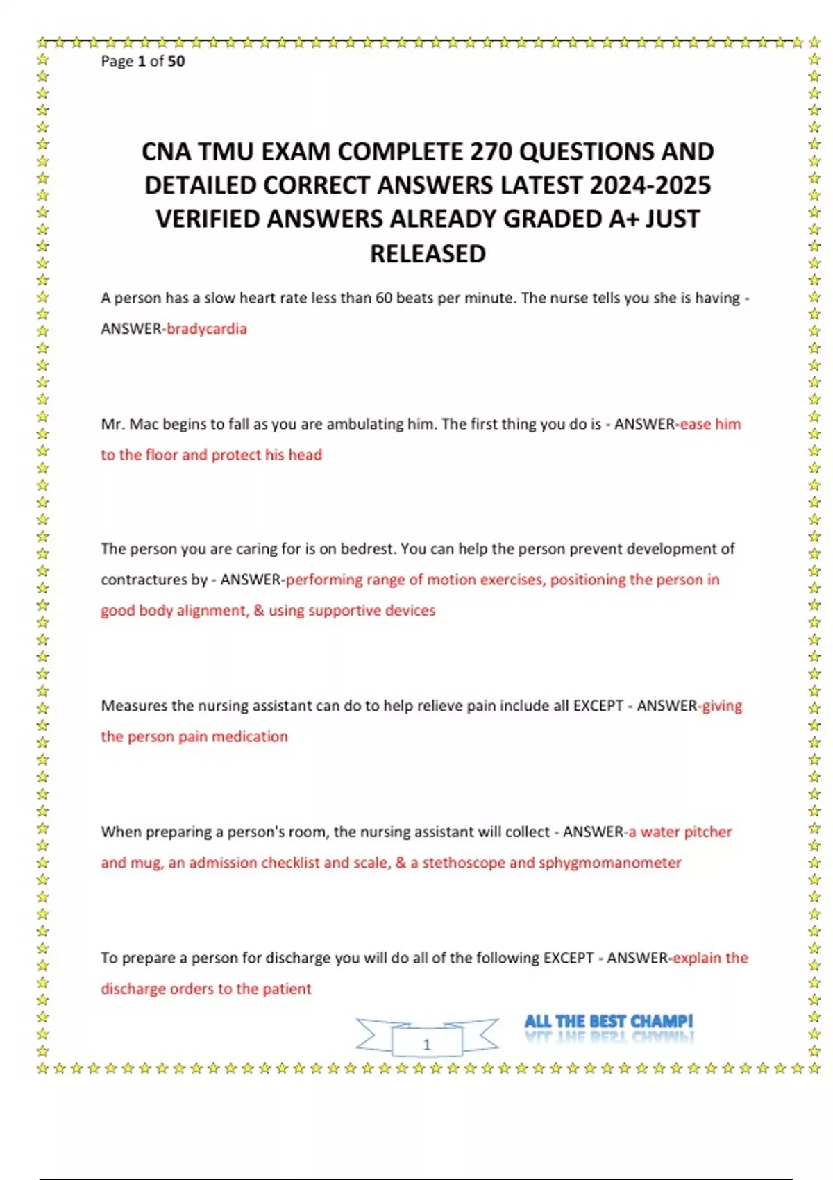 battery Nursing Assistants - ANSWER -take vital signs A nurse assigns you a task. You do not understand the instructions. You should - ANSWER -ask the nurse for clarification What are your legal and ethical responsibilities if you have access to medical records? - ANSWER -to keep all information confidential Which statement abo ut charting is incorrect? - ANSWER -all entries must be in pencil What are the parts that make up the whole person? - ANSWER -spiritual, social, physical, psychological The following are patient's rights EXCEPT - ANSWER -to abuse others Page 4 of 50 4 The branch of medicine concerned with the problems and diseases of old age and the elderly is called - ANSWER -geriatrics When care must be given to your patient and visitors are in the room you should - ANSWER -