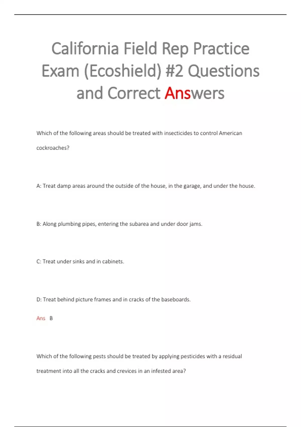 California Field Rep Practice Exam (Ecoshield) #2 Questions and Correct Answers