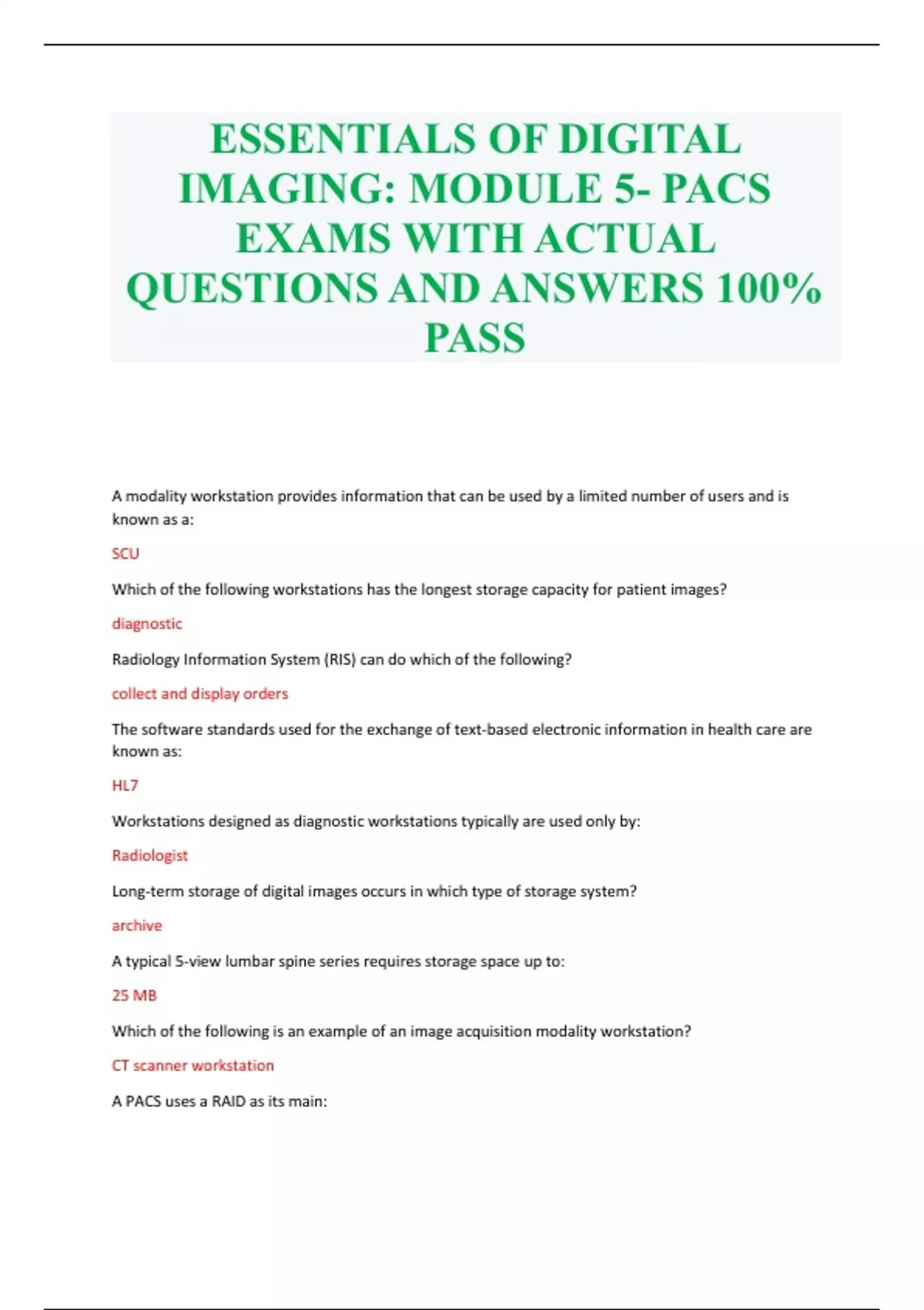 ESSENTIALS OF DIGITAL IMAGING: MODULE 5- PACS EXAMS WITH ACTUAL QUESTIONS AND ANSWERS 100% PASSESSENTIALS OF DIGITAL IMAGING: MODULE 5- PACS EXAMS WITH ACTUAL QUESTIONS AND ANSWERS 100% PASS