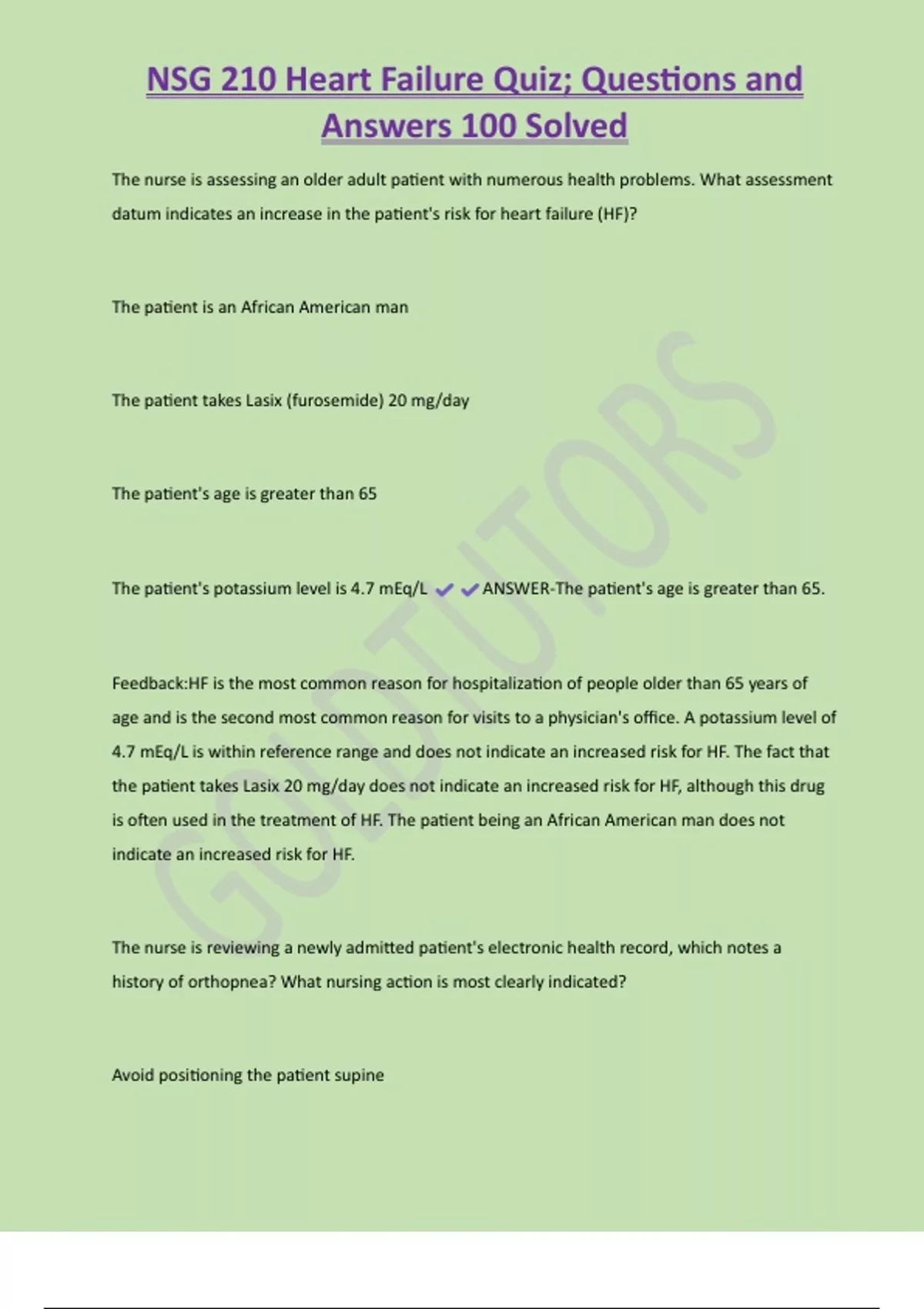 NSG 210 Heart Failure Quiz; Questions and Answers 100 Solved The nurse is assessing an older adult patient with numerous health problems. What assessment datum indicates an increase in the patient's risk for heart failure (HF)? The patient is an African American man The patient takes Lasix (furosemide) 20 mg/day The patient's age is greater than 65 The patient's potassium level is 4.7 mEq/L ANSWER-The patient's age is greater than 65.
