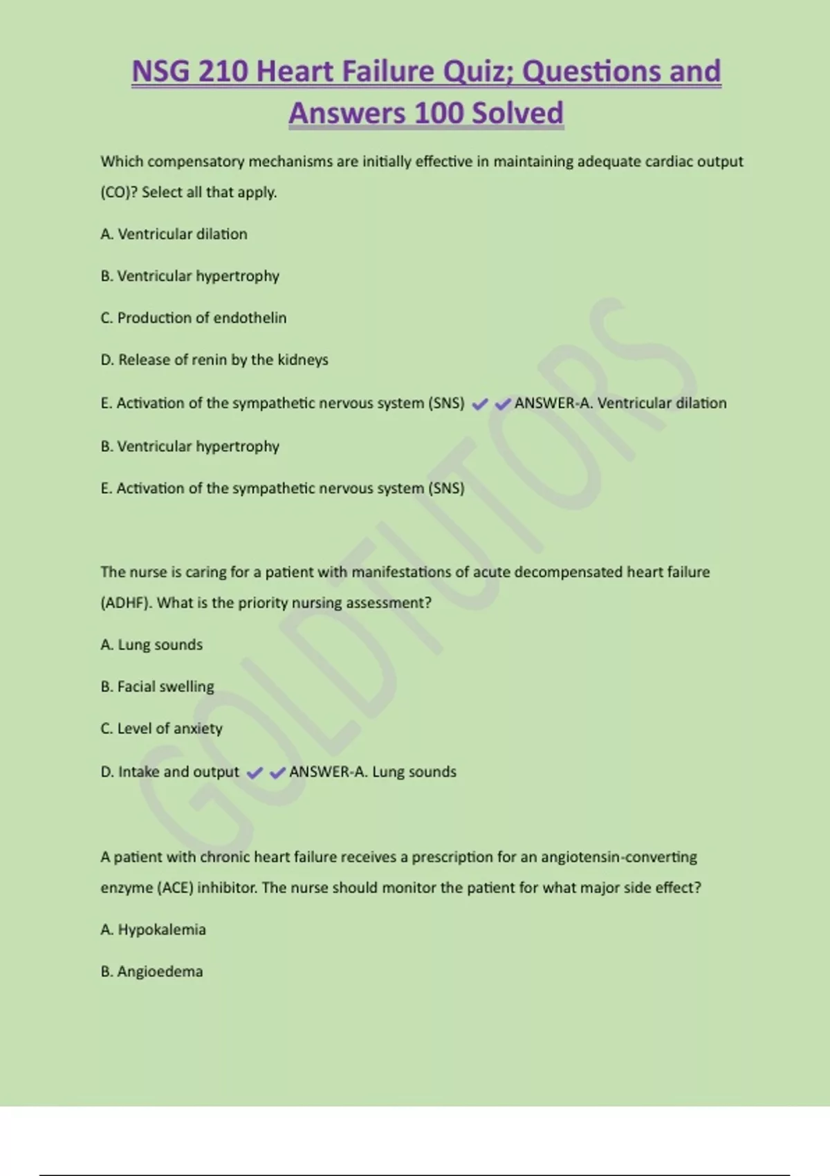 NSG 210 Heart Failure Quiz; Questions and Answers 100 Solved