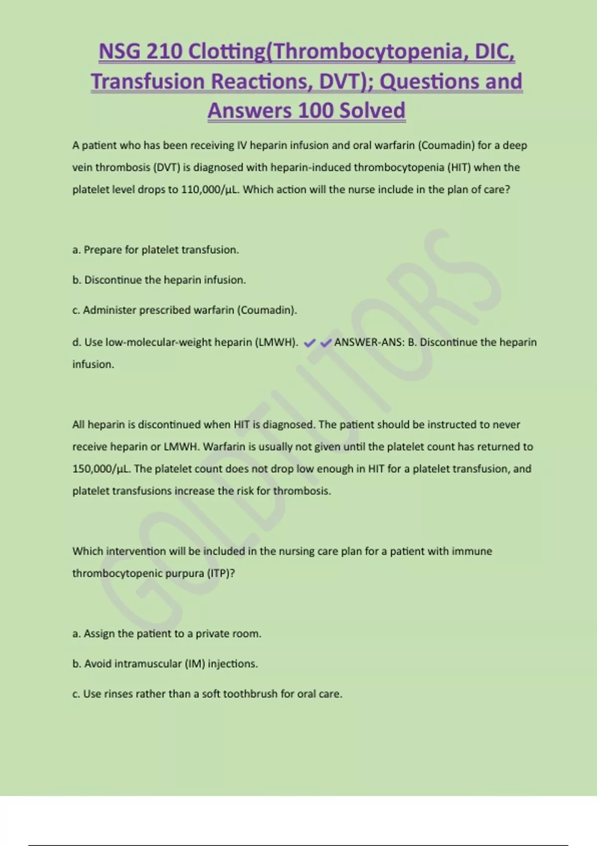 NSG 210 Clotting(Thrombocytopenia, DIC, Transfusion Reactions, DVT); Questions and Answers 100 Solved A patient who has been receiving IV heparin infusion and oral warfarin (Coumadin) for a deep vein thrombosis (DVT) is diagnosed with heparin-induced thrombocytopenia (HIT) when the platelet level drops to 110,000/µL. Which action will the nurse include in the plan of care?