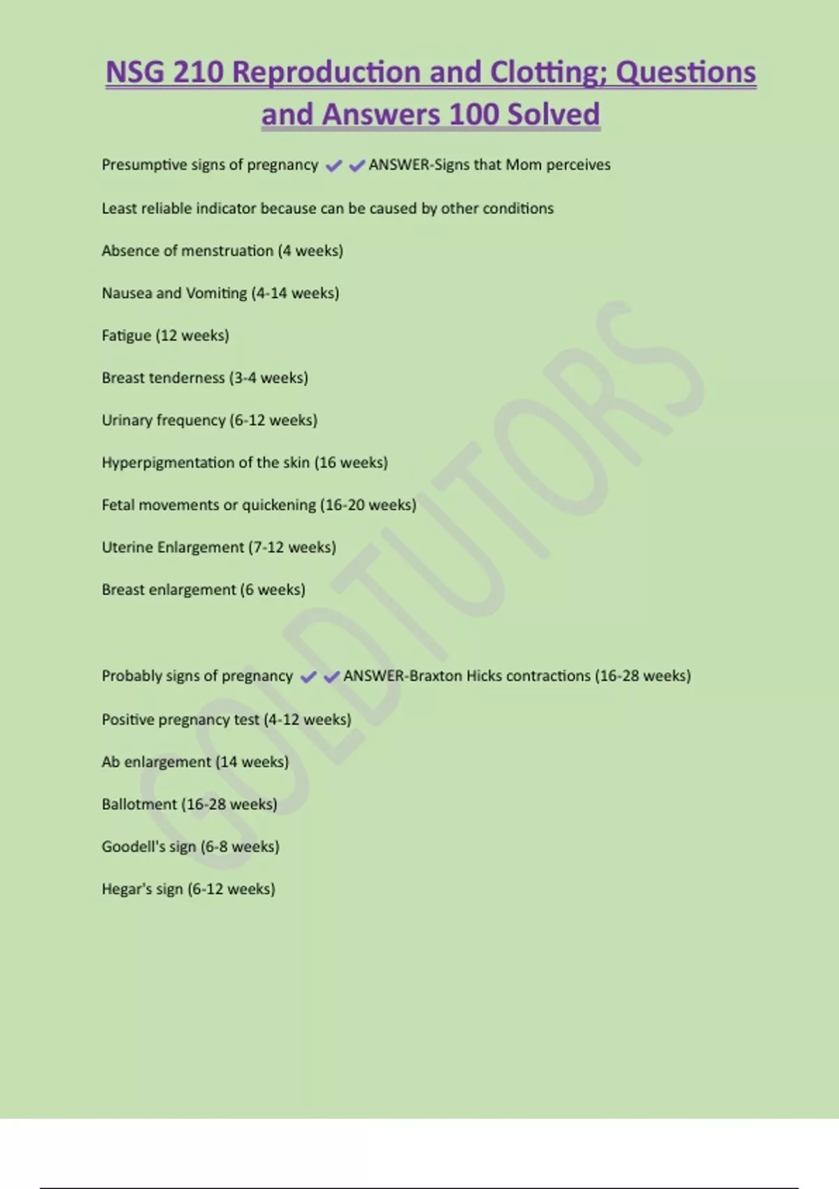 NSG 210 Reproduction and Clotting; Questions and Answers 100 Solved Presumptive signs of pregnancy ANSWER-Signs that Mom perceives Least reliable indicator because can be caused by other conditions Absence of menstruation (4 weeks) Nausea and Vomiting (4-14 weeks) Fatigue (12 weeks) Breast tenderness (3-4 weeks) Urinary frequency (6-12 weeks) Hyperpigmentation of the skin (16 weeks) Fetal movements or quickening (16-20 weeks) Uterine Enlargement (7-12 weeks) Breast enlargement (6 week
