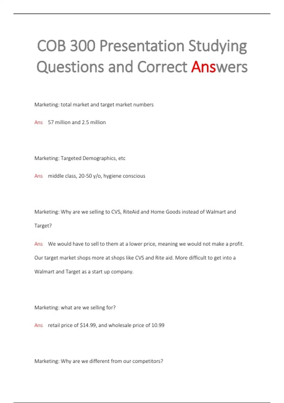 Marketing: total market and target market numbers Ans 57 million and 2.5 million Marketing: Targeted Demographics, etc Ans middle class, 20-50 y/o, hygiene conscious Marketing: Why are we selling to CVS, RiteAid and Home Goods instead of Walmart and Target? Ans We would have to sell to them at a lower price, meaning we would not make a profit. Our target market shops more at shops like CVS and Rite aid. More difficult to get into a Walmart and Target as a start up company. Marketing: what are we selling for? Ans retail price of $14.99, and wholesale price of 10.99 Marketing: Why are we different from our competitors? Ans we offer a low cost multifunctional sponge wringer and holder. Our competitors sell a single function holder wringer at either a low or high price. Sponge bath is only real competitor because they are multifunctional but sold at a high price. Marketing: What is our marketing objective? Ans market share because our market is mature with a multitude of other competitors, so growing our market share will be vital Marketing: What is our basis of pricing? Ans competitive based pricing because our prices are based on what our competitors are charging for their products. Our fixed and variable costs are a factor too. Price determined by comparing our products to other sponge holders like OXO, SunnyPoint, etc Marketing: What is our marketing strategy? Ans New product pricing to enter the market at a lower price to try to steal market share from competitors Marketing: What is our market maturity