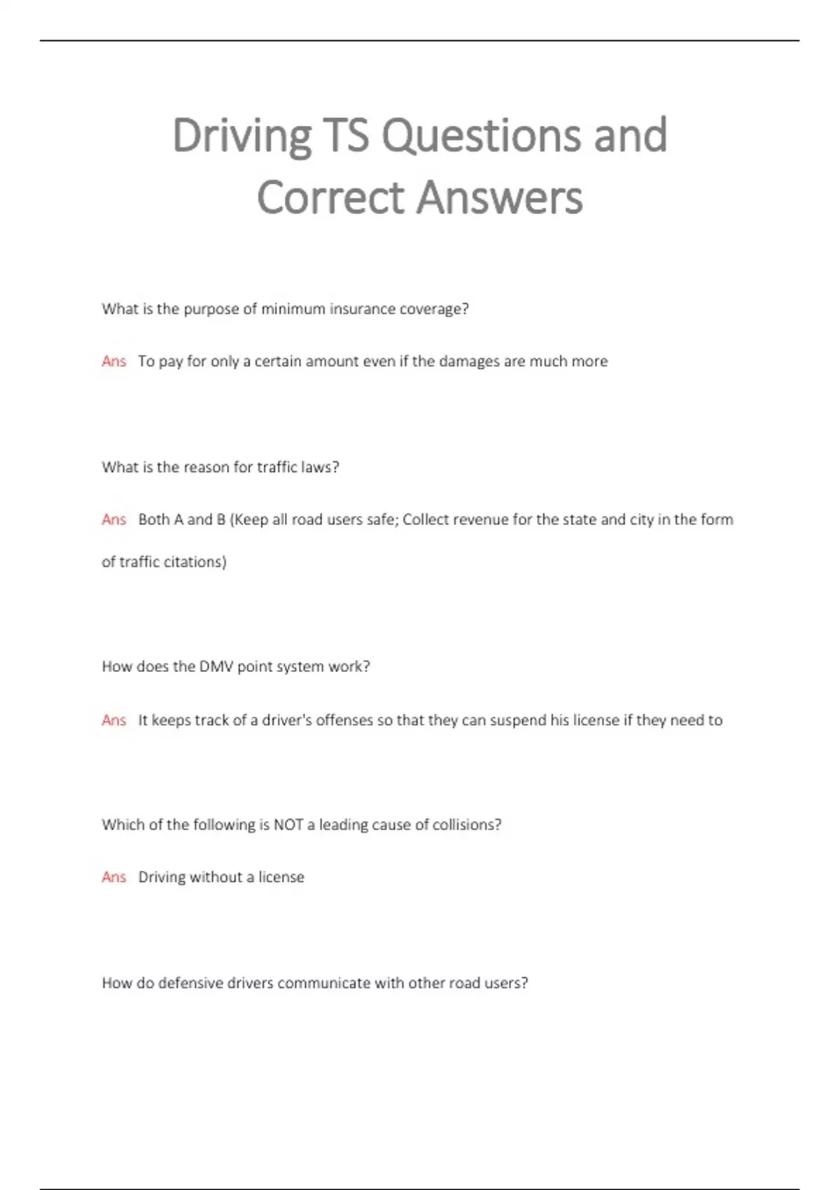 What is the purpose of minimum insurance coverage? Ans To pay for only a certain amount even if the damages are much more What is the reason for traffic laws? Ans Both A and B (Keep all road users safe; Collect revenue for the state and city in the form of traffic citations) How does the DMV point system work? Ans It keeps track of a driver's offenses so that they can suspend his license if they need to Which of the following is NOT a leading cause of collisions? Ans Driving without a license How do defensive drivers communicate with other road users? Ans All of the above (Use the horn only as a way to warn others of a problem on the road or of their presence; Get their attention by using eye contact; Use turn signals at least 100 feet before turning or changing lanes) When should drivers be courteous to each other? Ans D. Always (As long as the other driver is courteous to them; There is no obligation to be courteous; In very sticky high traffic situations) What is the best way to drive over a pothole if you can't swerve around it? Ans Press the brakes and slow down before reaching the pothole but then let go as you go over the pothole