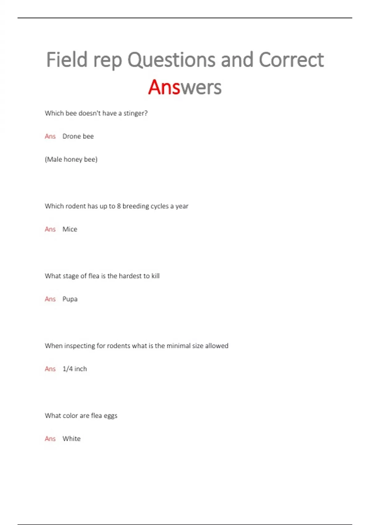 Which bee doesn't have a stinger? Ans Drone bee (Male honey bee) Which rodent has up to 8 breeding cycles a year Ans Mice What stage of flea is the hardest to kill Ans Pupa When inspecting for rodents what is the minimal size allowed Ans 1/4 inch What color are flea eggs Ans White How long does it take a beg bug to digest a blood meal Ans A few days to a few weeks How many days can an unlicensed person apply chemicals under direct supervision Ans 30 days If a death occurs from a pesticide who do you report to Ans Agriculture department Which cricket is about 2 in long and bites with most force Ans Jerusalem cricket Which insect will you find around potted plants Ans Fungus gnat When spraying for fleas exterior, where would you concentrate your spray Ans Shaded area