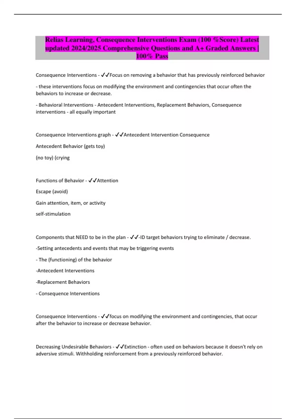 Relias Learning, Consequence Interventions Exam (100 %Score) Latest updated 2024/2025 Comprehensive Questions and A+ Graded Answers | 100% Pass