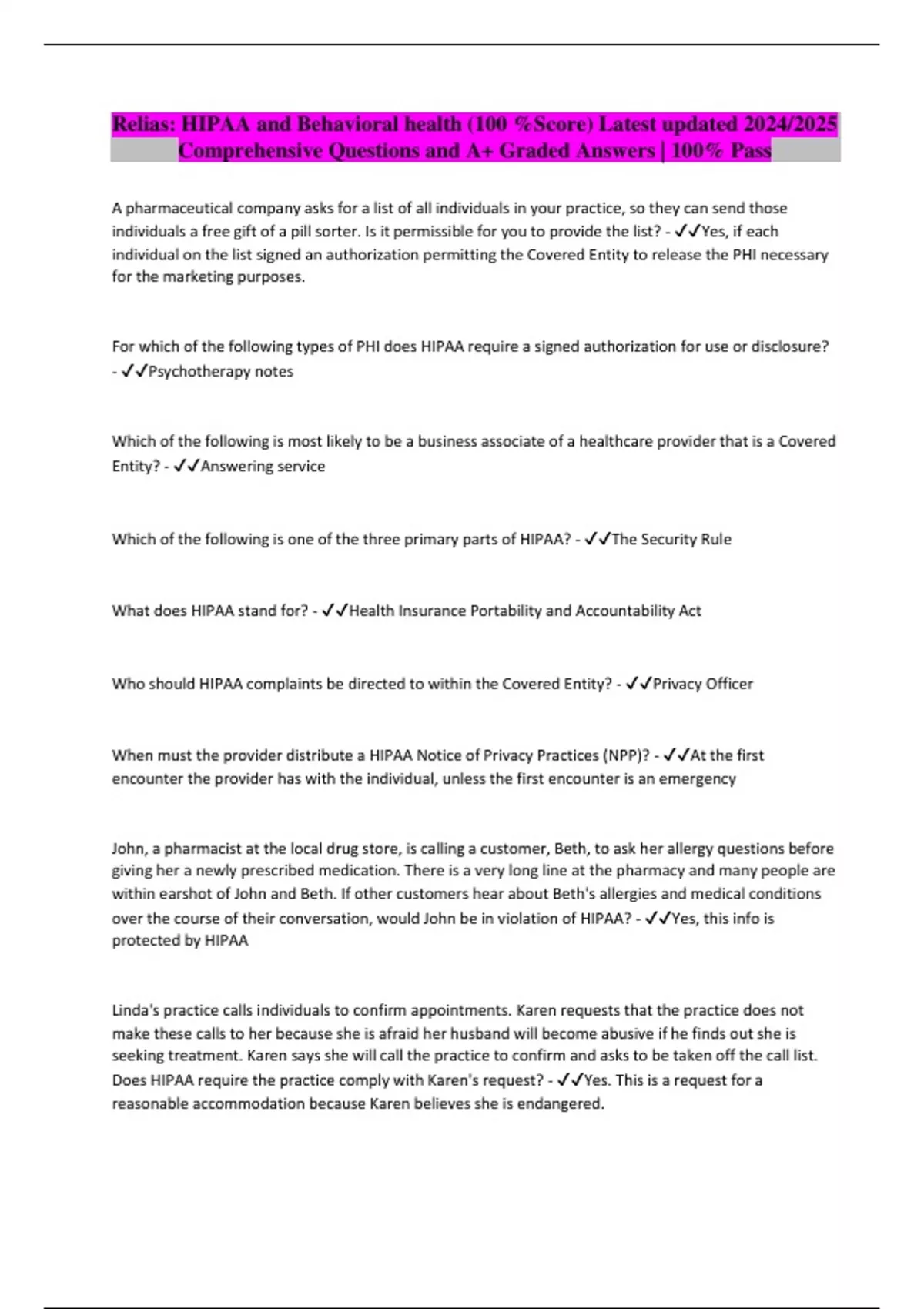 Relias: HIPAA and Behavioral health (100 %Score) Latest updated 2024/2025 Comprehensive Questions and A+ Graded Answers | 100% Pass