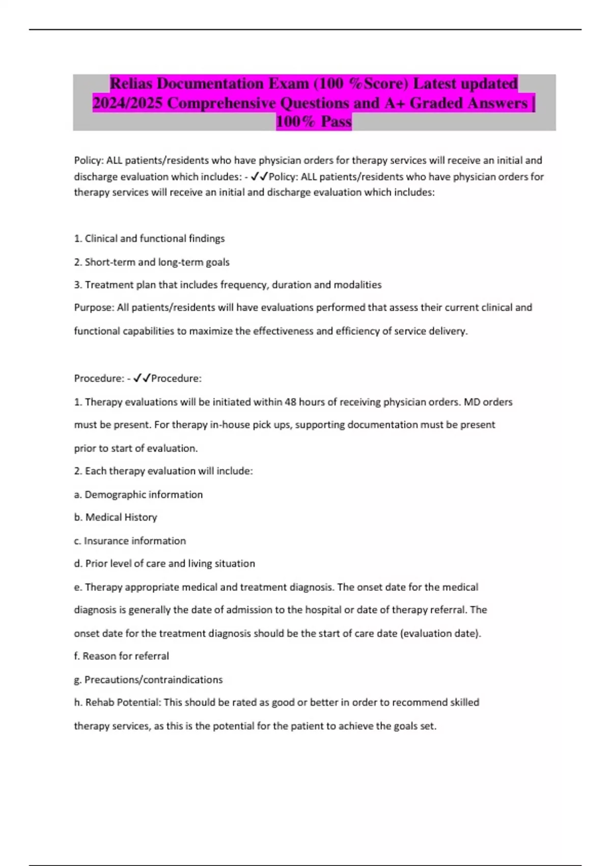 Relias Documentation Exam (100 %Score) Latest updated 2024/2025 Comprehensive Questions and A+ Graded Answers | 100% Pass