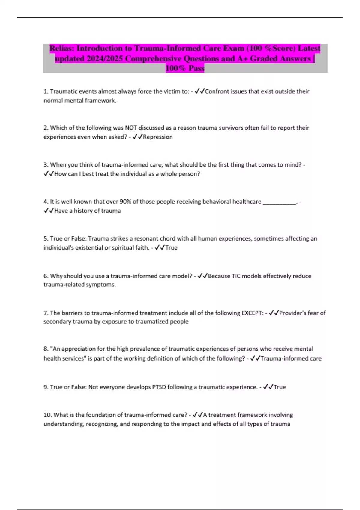 Relias: Introduction to Trauma-Informed Care Exam (100 %Score) Latest updated 2024/2025 Comprehensive Questions and A+ Graded Answers | 100% Pass