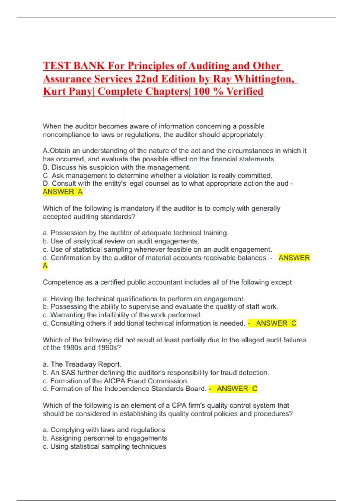 TEST BANK For Principles of Auditing and Other Assurance Services 22nd Edition by Ray Whittington