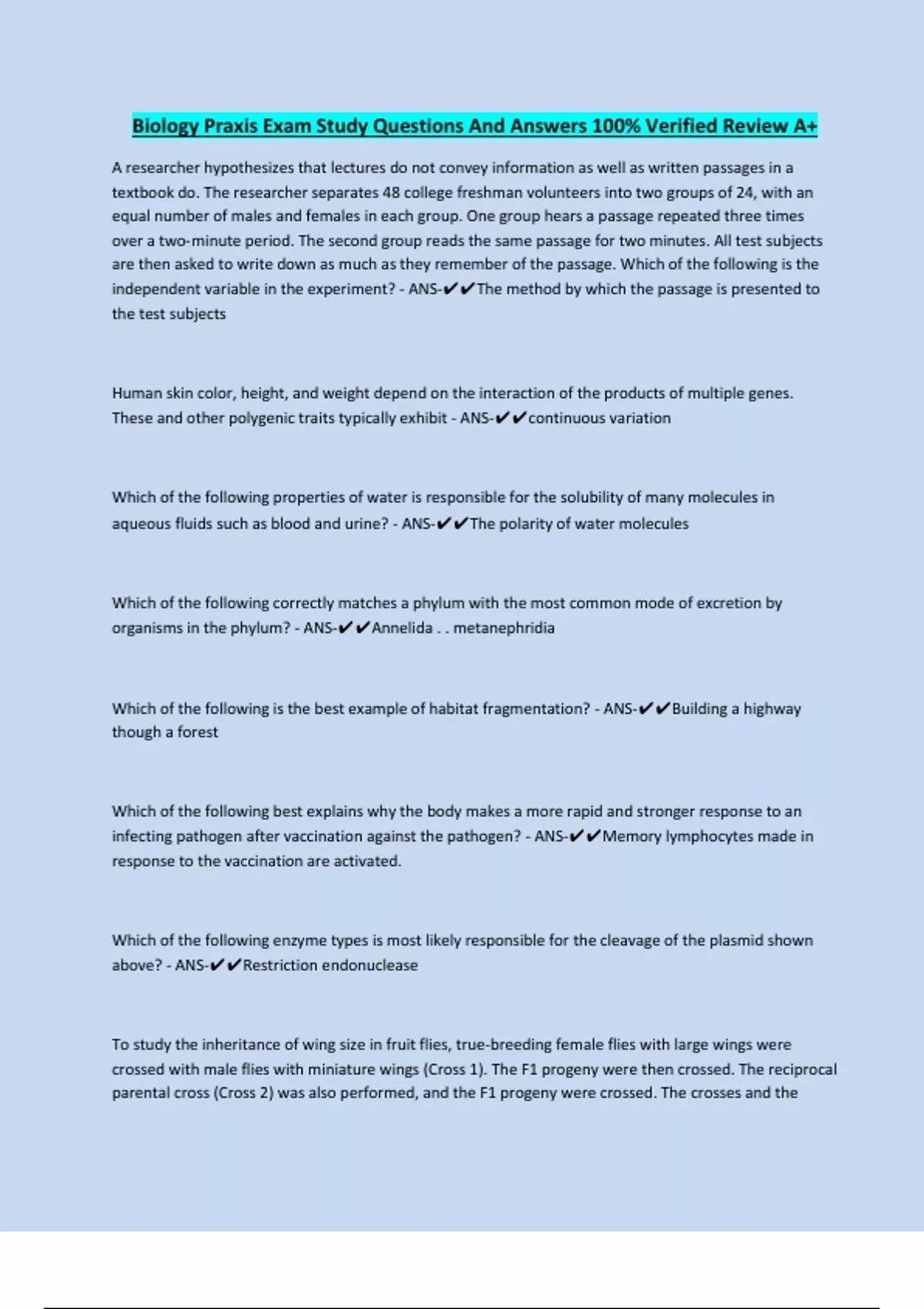 Biology Praxis Exam Study Questions And Answers 100% Verified Review A+ A researcher hypothesizes that lectures do not convey information as well as written passages in a textbook do. The researcher separates 48 college freshman volunteers into two groups of 24, with an equal number of males and females in each group. One group hears a passage repeated three times over a two‑minute period. The second group reads the same passage for two minutes. All test subjects are then asked to write down as much as they remember of the passage. Which of the following is the independent variable in the experiment? - ANS-The method by which the passage is presented to the test subjects Human skin color, height, and weight depend on the interaction of the products of multiple genes. These and other polygenic traits typically exhibit - ANS-continuous variation Which of the following properties of water is responsible for the solubility of many molecules in aqueous fluids such as blood and urine? - ANS-The polarity of water molecules Which of the following correctly matches a phylum with the most common mode of excretion by organisms in the phylum? - ANS-Annelida . . metanephridia Which of the following is the best example of habitat fragmentation? - ANS-Building a highway though a forest Which of the following best explains why the body makes a more rapid and stronger response to an infecting pathogen after vaccination against the pathogen? - ANS-Memory lymphocytes made in response to the vaccination are activated. Which of the following enzyme types is most likely responsible for the cleavage of the plasmid shown above? - ANS-Restriction endonuclease To study the inheritance of wing size in fruit flies, true-breeding female flies with large wings were crossed with male flies with miniature wings (Cross 1). The F1 progeny were then crossed. The reciprocal parental cross (Cross 2) was also performed, and the F1 progeny were crossed. The crosses and the results are summarized in the table above. Based on the data, which TWO of the following statements are most likely correct? - ANS-...