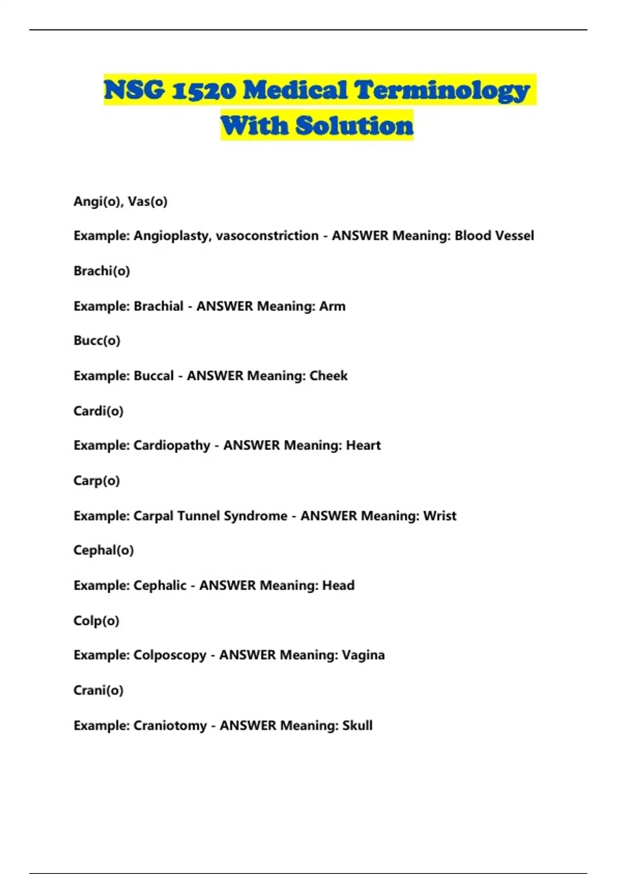 NSG 1520 Medical Terminology With Solution