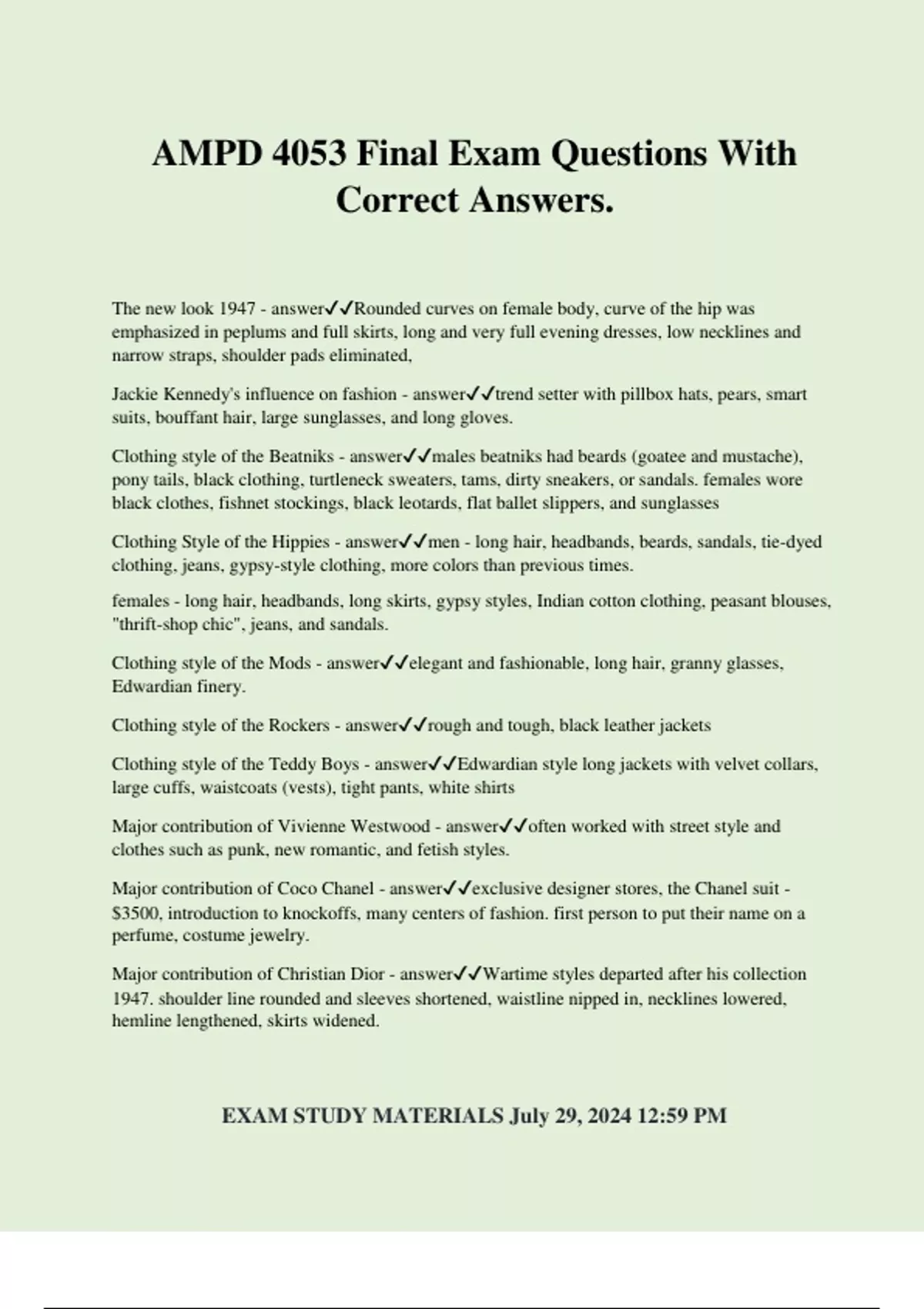 AMPD 4053 Final Exam Questions With Correct Answers. The new look 1947 - answerRounded curves on female body, curve of the hip was emphasized in peplums and full skirts, long and very full evening dresses, low necklines and narrow straps, shoulder pads eliminated, Jackie Kennedy's influence on fashion - answertrend setter with pillbox hats, pears, smart suits, bouffant hair, large sunglasses, and long gloves. Clothing style of the Beatniks - answermales beatniks had beards (goatee and mustache), pony tails, black clothing, turtleneck sweaters, tams, dirty sneakers, or sandals. females wore black clothes, fishnet stockings, black leotards, flat ballet slippers, and sunglasses Clothing Style of the Hippies - answermen - long hair, headbands, beards, sandals, tie-dyed clothing, jeans, gypsy-style clothing, more colors than previous times. females - long hair, headbands, long skirts, gypsy styles, Indian cotton clothing, peasant blouses, "thrift-shop chic", jeans, and sandals. Clothing style of the Mods - answerelegant and fashionable, long hair, granny glasses, Edwardian finery. Clothing style of the Rockers - answerrough and tough, black leather jackets Clothing style of the Teddy Boys - answerEdwardian style long jackets with velvet collars, large cuffs, waistcoats (vests), tight pants, white shirts Major contribution of Vivienne Westwood - answeroften worked with street style and clothes such as punk, new romantic, and fetish styles. Major contribution of Coco Chanel - answerexclusive designer stores, the Chanel suit - $3500, introduction to knockoffs, many centers of fashion. first person to put their name on a perfume, costume jewelry. Major contribution of Christian Dior - answerWartime styles departed after his collection 1947. shoulder line rounded and sleeves shortened, waistline nipped in, necklines lowered, hemline lengthened, skirts widened