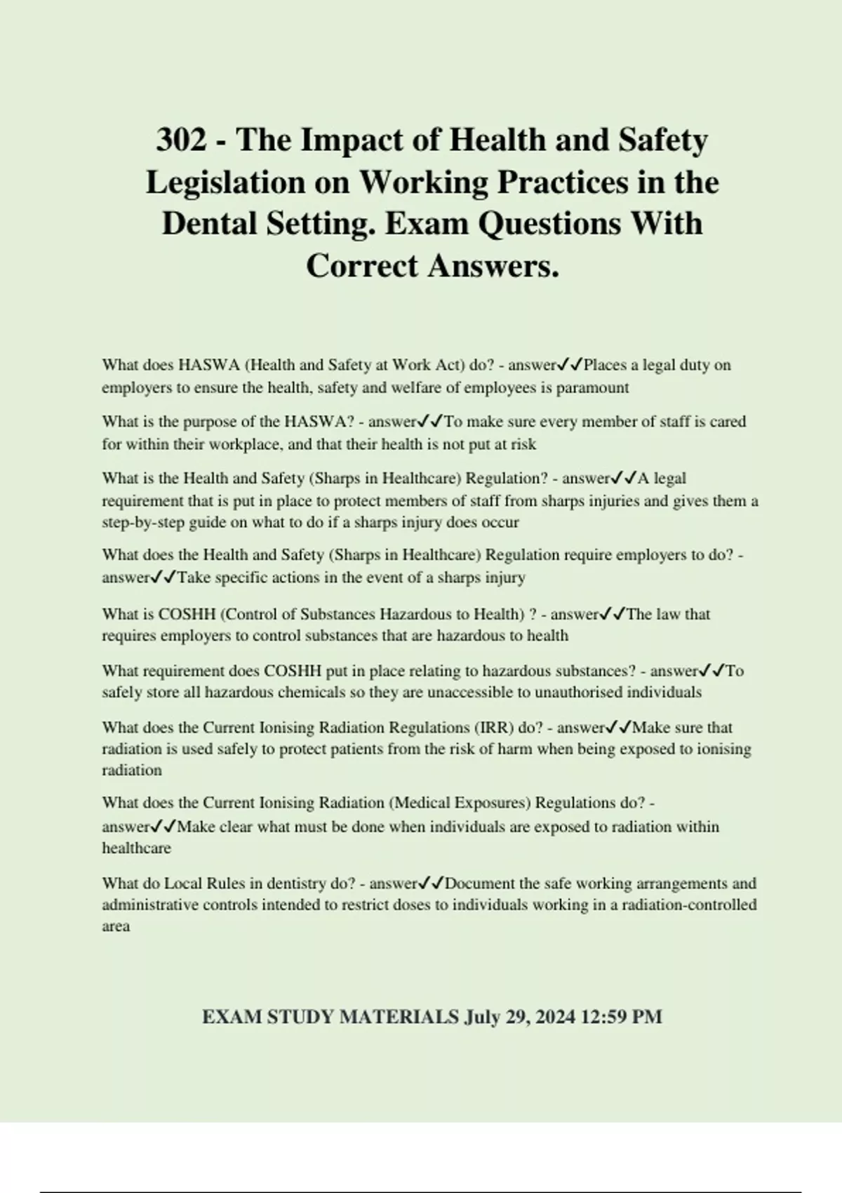 302 - The Impact of Health and Safety Legislation on Working Practices in the Dental Setting. Exam Questions With Correct Answers. What does HASWA (Health and Safety at Work Act) do? - answerPlaces a legal duty on employers to ensure the health, safety and welfare of employees is paramount What is the purpose of the HASWA? - answerTo make sure every member of staff is cared for within their workplace, and that their health is not put at risk What is the Health and Safety (Sharps in Healthcare) Regulation? - answerA legal requirement that is put in place to protect members of staff from sharps injuries and gives them a step-by-step guide on what to do if a sharps injury does occur What does the Health and Safety (Sharps in Healthcare) Regulation require employers to do? - answerTake specific actions in the event of a sharps injury What is COSHH (Control of Substances Hazardous to Health) ? - answerThe law that requires employers to control substances that are hazardous to health What requirement does COSHH put in place relating to hazardous substances? - answerTo safely store all hazardous chemicals so they are unaccessible to unauthorised individuals What does the Current Ionising Radiation Regulations (IRR) do? - answerMake sure that radiation is used safely to protect patien