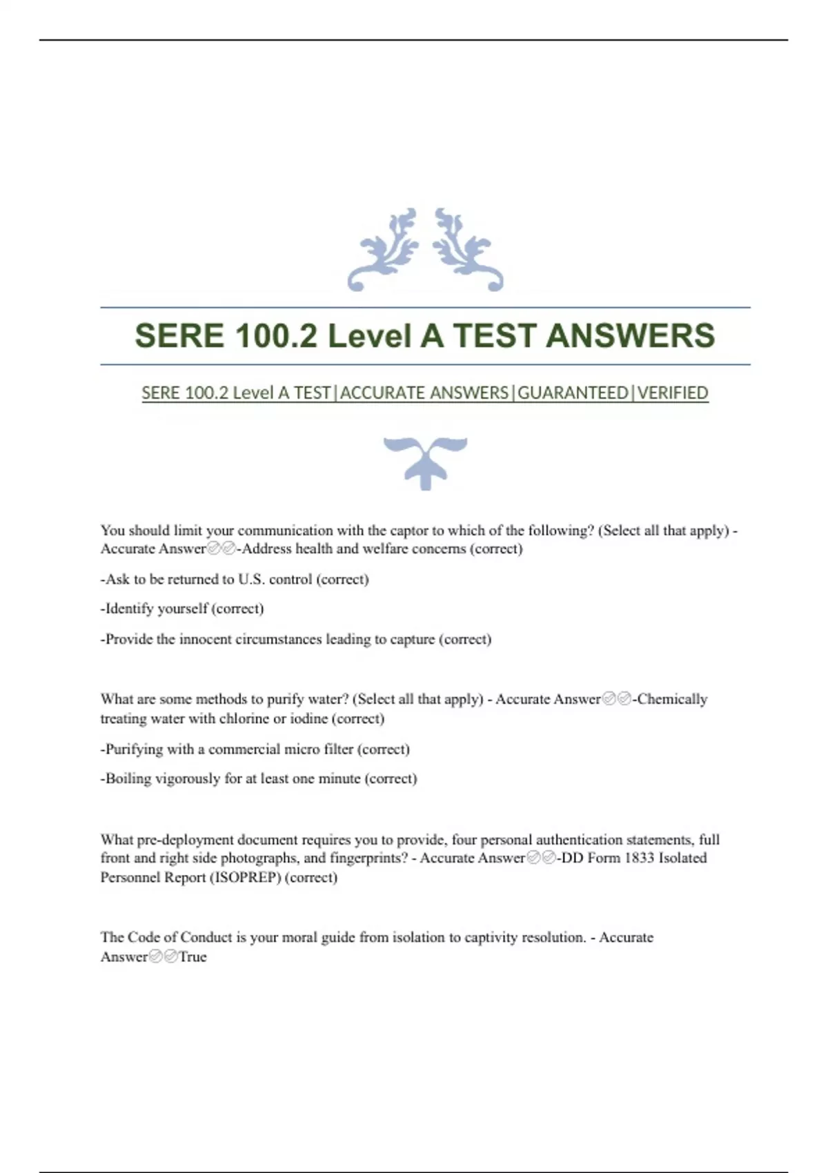 SERE 100.2 Level A TEST ANSWERS SERE 100.2 Level A TEST|ACCURATE ANSWERS|GUARANTEED|VERIFIED You should limit your communication with the captor to which of the following? (Select all that apply) - Accurate Answer-Address health and welfare concerns (correct) -Ask to be returned to U.S. control (correct) -Identify yourself (correct) -Provide the innocent circumstances leading to capture (correct) What are some methods to purify water? (Select all that apply) - Accurate Answer-Chemically treating water with chlorine or iodine (correct) -Purifying with a commercial micro filter (correct) -Boiling vigorously for at least one minute (correct) What pre-deployment document requires you to provide, four personal authentication statements, full front and right side photographs, and fingerprints? - Accurate Answer-DD Form 1833 Isolated Personnel Report (ISOPREP) (correct) The Code of Conduct is your moral guide from isolation to captivity resolution. - Accurate AnswerTrue The Evasion Plan of Action (EPA) provides recovery forces the following information should you become isolated. (Select all that apply) - Accurate Answer-It helps them to anticipate your actions and intentions should you become isolated (correct) -Ensure you detail the factors concerning the methods and procedures you intend to use to communicate with recovery forces (correct) -Your evasion intentions and key recovery information (correct) One way to gain acceptance from the local population after making contact is to discuss the similarities between your religions. This helps to show you are peaceful and mean no harm. - Accurate AnswerFalse To which article of the Code of Conduct does the following statement refer? If captured I will continue to resist by all means available. I will make every effort to escape and aid others to escape. I will accept neither parole nor special favors from the enemy. - Accurate AnswerArticle III (correct) Upon your release, a DoD Public Affairs Officer (PAO) will be available to help you. Their goal is to_______________________________________. (Select all that apply) - Accurate Answer-coordinate your interactions with the media (correct) -help you regain control over your life (correct) The Code of Conduct is a ____________ for military members when isolated or held against their will by entities
