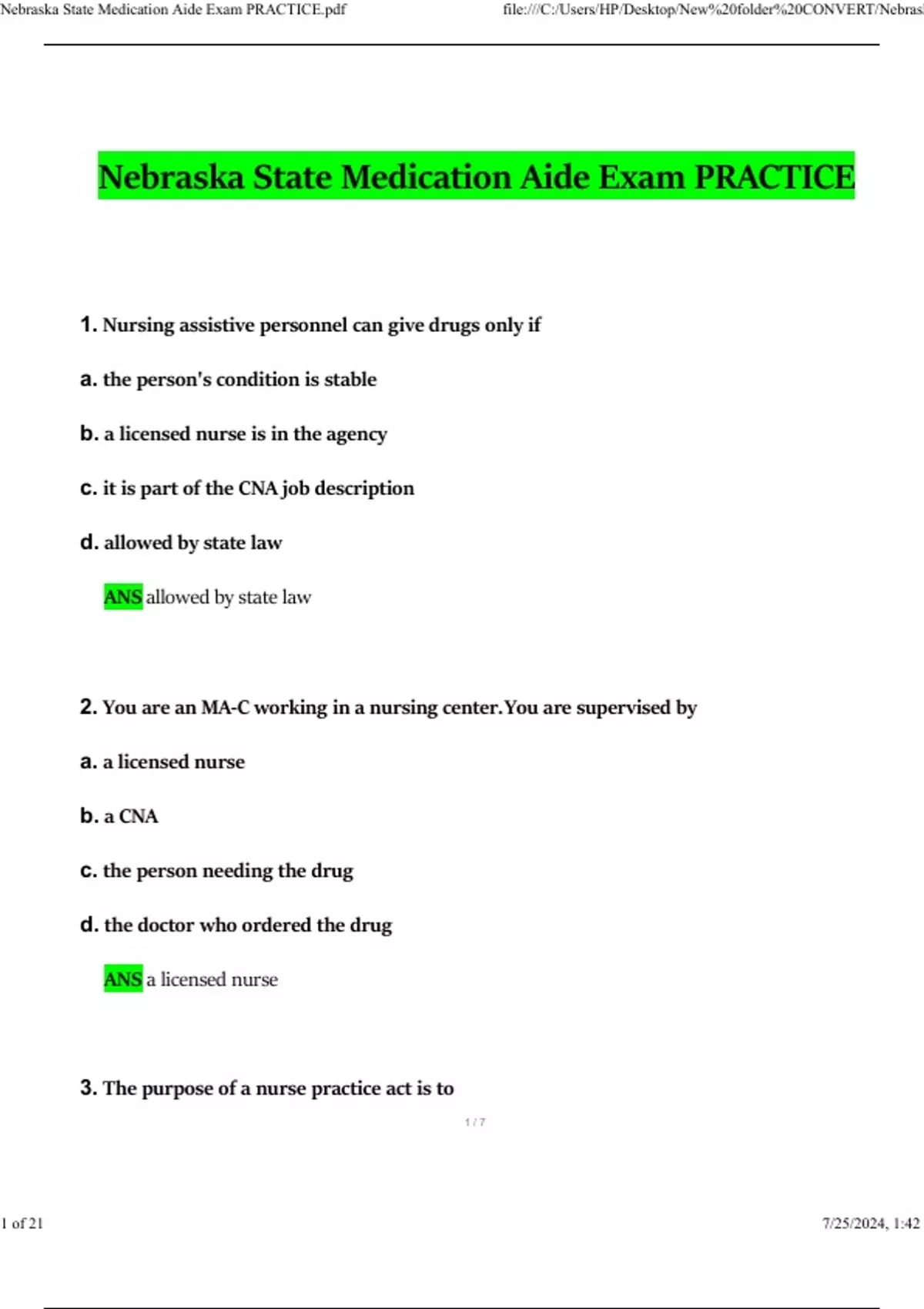 3.The purpose of a nurse practice act is toNebraska State Medication Aide Exam PRACTICE.pdf file:///C:/Users/HP/Desktop/New%20folder%20CONVERT/Nebraska...