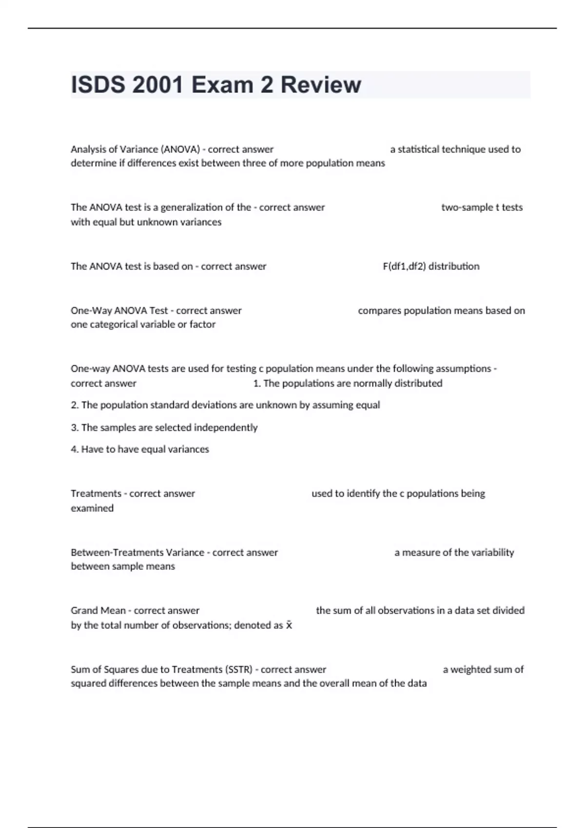 Analysis of Variance (ANOVA) - correct answer a statistical technique used to determine if differences exist between three of more population means The ANOVA test is a generalization of the - correct answer two-sample t tests with equal but unknown variances The ANOVA test is based on - correct answer F(df1,df2) distribution One-Way ANOVA Test - correct answer compares population means based on one categorical variable or factor One-way ANOVA tests are used for testing c population means under the following assumptions - correct answer 1. The populations are normally distributed 2. The population standard deviations are unknown by assuming equal 3. The samples are selected independently 4. Have to have equal variances Treatments - correct answer used to identify the c populations being examined Between-Treatments Variance - correct answer a measure of the variability between sample means Grand Mean - correct answer the sum of all observations in a data set divided by the total number of observations; denoted as x̄ Sum of Squares due to Treatments (SSTR) - correct answer a weighted sum of squared differences between the sample means and the overall mean of the data Mean Square Treatment (MSTR) - correct answer SSTR / c-1 Within-Treatments Variance - correct answer a measure of the variability within each sample Error Sum of Squares (SSE) - correct answer a measure of the degree of variability that exists even if all population means are the same Mean Square Error (MSE) - correct answer the average of the error (residual) sum of squares, where the residual is the difference between the observed and the predicted value of a variable The dependent variable is measured from - correct answer observations randomly selected from independent normal populations with equal variances If F statistic > F critical Value - correct answer reject H0 If p < a - correct answer reject H0 Total Sum of Squares (SST) - correct answer the sum of the squared differences of each observation from the grand mean Fisher's Least Significant Difference (LSD) - correct answer a test that determines which means significantly differ by computing all pairwise differences of the means Turkey's honestly significant difference (HSD) - correct answer a method that determines which means significantly differ by comparing all pairwise difference of the means Set up Factor B to control for differences that you expect, so - correct answer that you can easily detect differences due to factor A