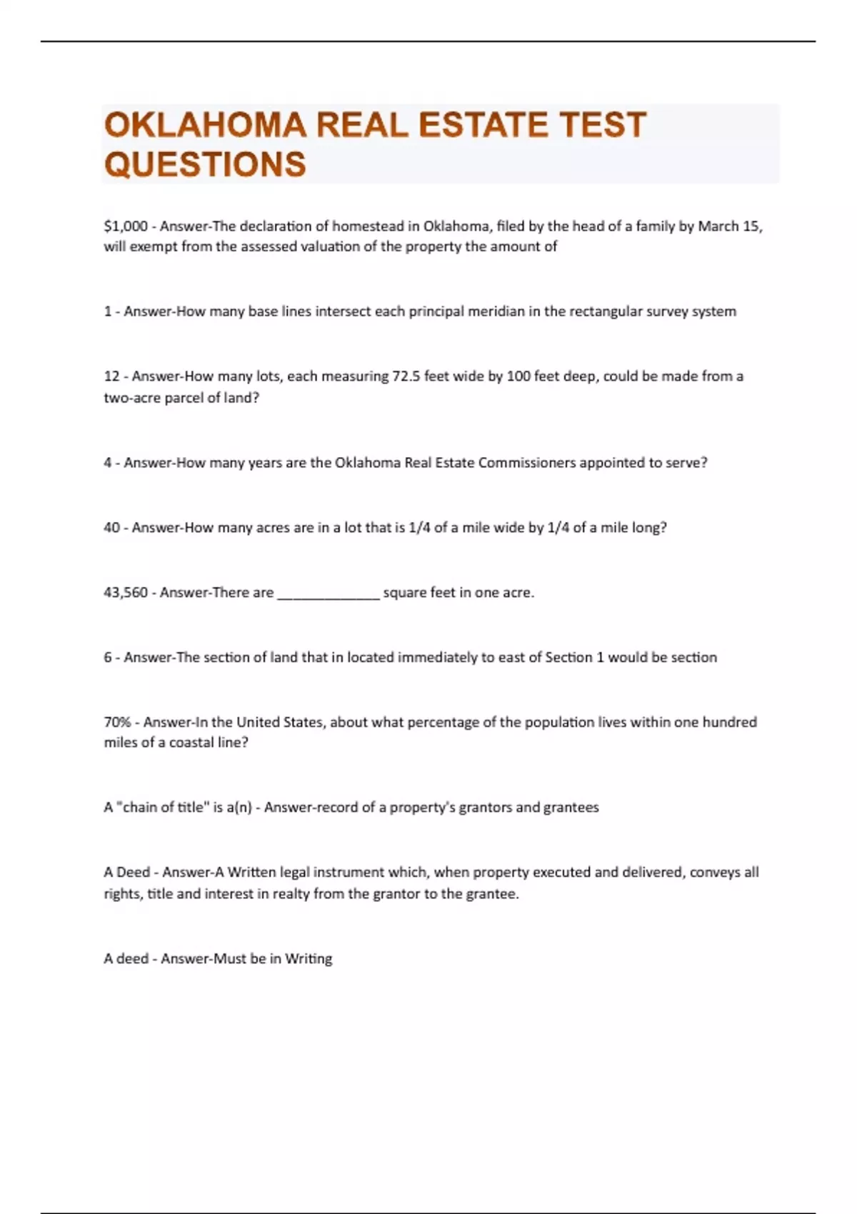 $1,000 - Answer-The declaration of homestead in Oklahoma, filed by the head of a family by March 15, will exempt from the assessed valuation of the property the amount of 1 - Answer-How many base lines intersect each principal meridian in the rectangular survey system 12 - Answer-How many lots, each measuring 72.5 feet wide by 100 feet deep, could be made from a two-acre parcel of land? 4 - Answer-How many years are the Oklahoma Real Estate Commissioners appointed to serve? 40 - Answer-How many acres are in a lot that is 1/4 of a mile wide by 1/4 of a mile long? 43,560 - Answer-There are _____________ square feet in one acre. 6 - Answer-The section of land that in located immediately to east of Section 1 would be section 70% - Answer-In the United States, about what percentage of the population lives within one hundred miles of a coastal line? A "chain of title" is a(n) - Answer-record of a property's grantors and grantees A Deed - Answer-A Written legal instrument which, when property executed and delivered, conveys all rights, title and interest in realty from the grantor to the grantee. A deed - Answer-Must be in WritingA Executes a deed to B. After A recorded it, B moves into the property. Later A seeks to set the conveyance aside, claiming that there had been no delivery of the deed. Why will A probably not succeed? - Answer-Delivery is presumed by recording. A grantor's interest, if any, in a property - Answer-A Quitclaim deed conveys which of the following? A life estate may be granted - Answer-For the duration of life of the grantee or the life of someone other than the grantee. A monument may be - Answer-Any physically identifiable object. A concrete marker on iron pipe. A parcel of real property may include - Answer-Land and improvements. mineral rights, trees,houses and septic tanks. Airspace, surface, and ground beneath the surface. A patent - Answer-The grant of title by a government body to individual persons is known as A recorded subdivision plat is used in the - Answer-lot and block system A tenant in common owning an undivided 1/2 interest - Answer-Ann and her brother, Bob, inherited under their mother's will title to a house in joint tenancy. Ann married and had title to her share put in joint tenancy with her husband. Bob is now A township is - Answer-6 miles square A valid deed must - Answer-Describe the property. Name the grantee. Name the grantor. abstract of title - Answer-A collection of all recorded instruments, chronologically arranged, affecting title to a parcel of real property is a(n)Accretion - Answer-The acquisition of land due to the gradual accumulation of soil /alluvion/ by natural causes, resulting in stream or river shoreline changes. Actual & Appartent - Answer-Agency Authority-For the purpose of real estate brokerage, Two major types are identified: Actual Authority - Answer-By far the MOST COMMON type. It is the authority specifically and clearly conferred by a principal. It consists of Expressed Authority & Implied Authority