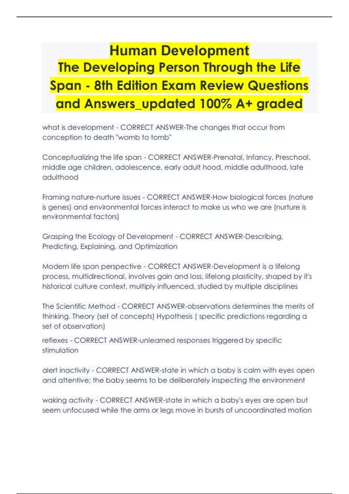 Human Development The Developing Person Through the Life Span - 8th Edition Exam Review Questions and Answers_updated 100% A+ graded what is development - CORRECT ANSWER-The changes that occur from conception to death "womb to tomb" Conceptualizing the life span - CORRECT ANSWER-Prenatal, Infancy, Preschool, middle age children, adolescence, early adult hood, middle adulthood, late adulthood Framing nature-nurture issues - CORRECT ANSWER-How biological forces (nature is genes) and environmental forces interact to make us who we are (nurture is environmental factors) Grasping the Ecology of Development - CORRECT ANSWER-Describing, Predicting, Explaining, and Optimization Modern life span perspective - CORRECT ANSWER-Development is a lifelong process, multidirectional, involves gain and loss, lifelong plasticity, shaped by it's historical culture context, multiply influenced, studied by multiple disciplines The Scientific Method - CORRECT ANSWER-observations determines the merits of thinking. Theory (set of concepts) Hypothesis ( specific predictions regarding a set of observation) reflexes - CORRECT ANSWER-unlearned responses triggered by specific stimulation alert inactivity - CORRECT ANSWER-state in which a baby is calm with eyes open and attentive; the baby seems to be deliberately inspecting the environment waking activity - CORRECT ANSWER-state in which a baby's eyes are open but seem unfocused while the arms or legs move in bursts of uncoordinated motion crying - CORRECT ANSWER-state in which a baby cries vigorously, usually accompanied by agitated but uncoordinated movement sleeping - CORRECT ANSWER-state in which a baby alternates from being still and breathing regularly to moving gently and breathing irregularly; the eyes are closed throughout basic cry - CORRECT ANSWER-cry that starts softly and gradually becomes more intense; often heard when babies are hungry or tired mad cry - CORRECT ANSWER-more intense version of a basic cry pain cry - CORRECT ANSWER-cry that begins with a sudden long burst, followed by a long pause and gasping irregular or rapid-eye-movement (REM) sleep - CORRECT ANSWER-irregular sleep in which an infant's eyes dart rapidly beneath the eyelids while the body is quite active regular or nonREM sleep - CORRECT ANSWER-sleep in which heart rate, breathing, and brain activity are steady sudden infant death syndrome (SIDS) - CORRECT ANSWER-when a healthy baby dies suddenly for no apparent reason temperament - CORRECT ANSWER-consistent style or pattern of behavior malnourished - CORRECT ANSWER-being small for one's age because of inadequate nutrition neuron - CORRECT ANSWER-basic cellular unit of the brain and nervous system that specializes in receiving and transmitting information cell body - CORRECT ANSWER-center of the neuron that keeps the neuron alive dendrite - CORRECT ANSWER-end of the neuron that receives information; it looks like a tree with many branches