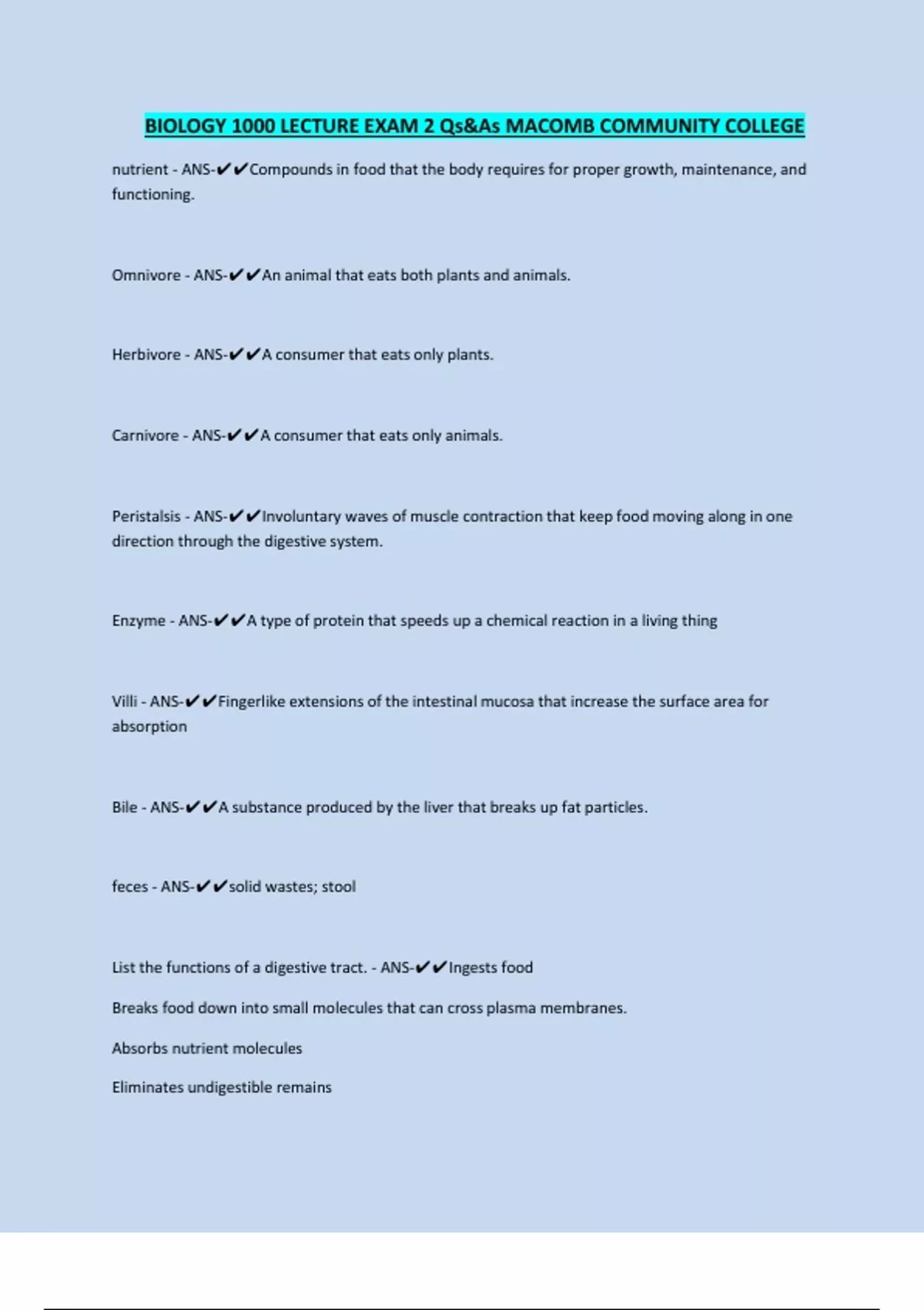 BIOLOGY 1000 LECTURE EXAM 2 Qs&As MACOMB COMMUNITY COLLEGE nutrient - ANS-Compounds in food that the body requires for proper growth, maintenance, and functioning. Omnivore - ANS-An animal that eats both plants and animals. Herbivore - ANS-A consumer that eats only plants. Carnivore - ANS-A consumer that eats only animals. Peristalsis - ANS-Involuntary waves of muscle contraction that keep food moving along in one direction through the digestive system. Enzyme - ANS-A type of protein that speeds up a chemical reaction in a living thing Villi - ANS-Fingerlike extensions of the intestinal mucosa that increase the surface area for absorption Bile - ANS-A substance produced by the liver that breaks up fat particles. feces - ANS-solid wastes; stool List the functions of a digestive tract. - ANS-Ingests food Breaks food down into small molecules that can cross plasma membranes. Absorbs nutrient molecules Eliminates undigestible remains Continues...